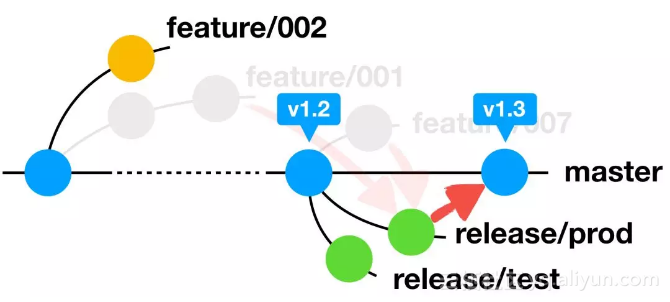 - 发布分支发布到线上后再合并回主干分支,并在主干分支打上标签,最后删除与该发布分支关联的特性分支。