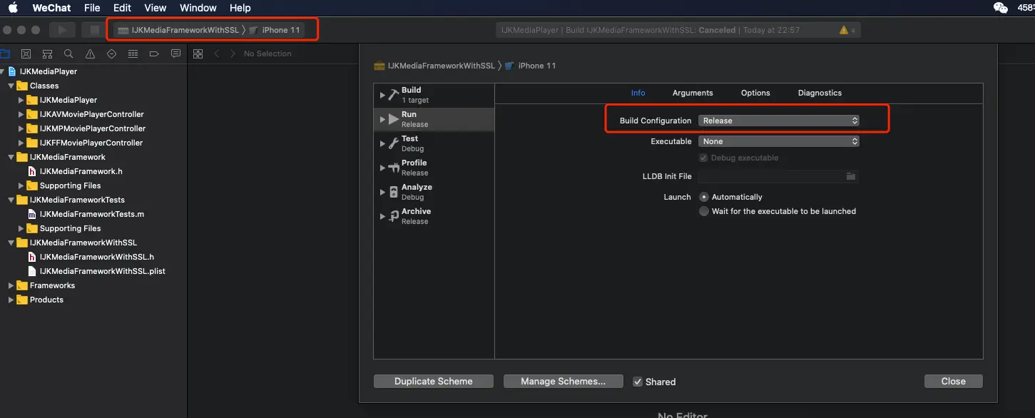 1. 打开ijkplayer项目工程后,然后选择需要的framework,有2个版本的framework。一为SSL,另外一个是不带SSL。正如上一篇所说的,带SSL就是可以访问https的URL。选择自己需要的版本,然后设置工程的 scheme 为release。如图