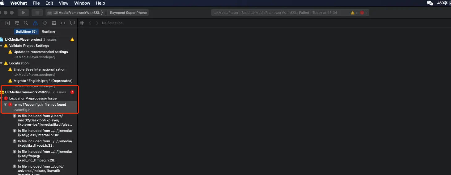 但因为ijkplayer对armv7的机器降低的支持,所以我们在使用iphone5s的机器以上,则会出现编译失败。主要是说不支持armv7的错误。主要的报错信息为:armv7/avconfig.h file not found 如图: