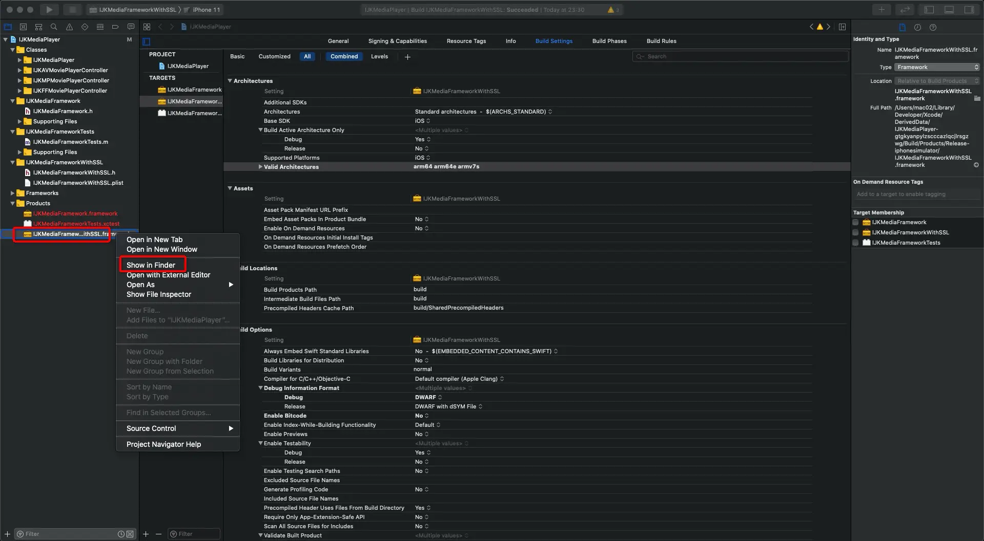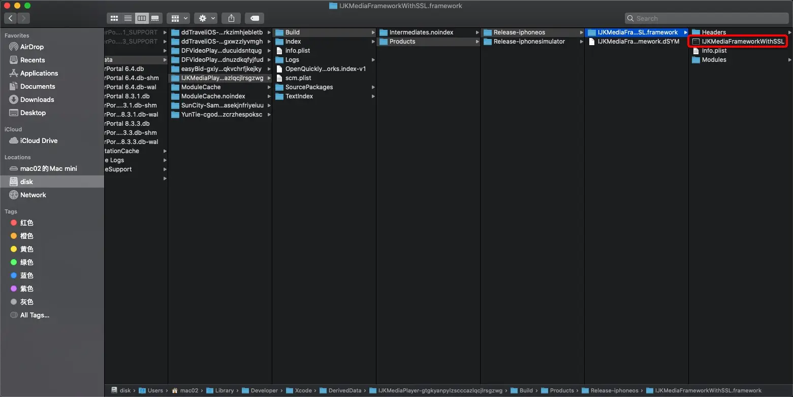 1. 首先把两个framework都找到。在项目的product文件夹中,找到编译好的framework,然后右键show in the finder.如图: