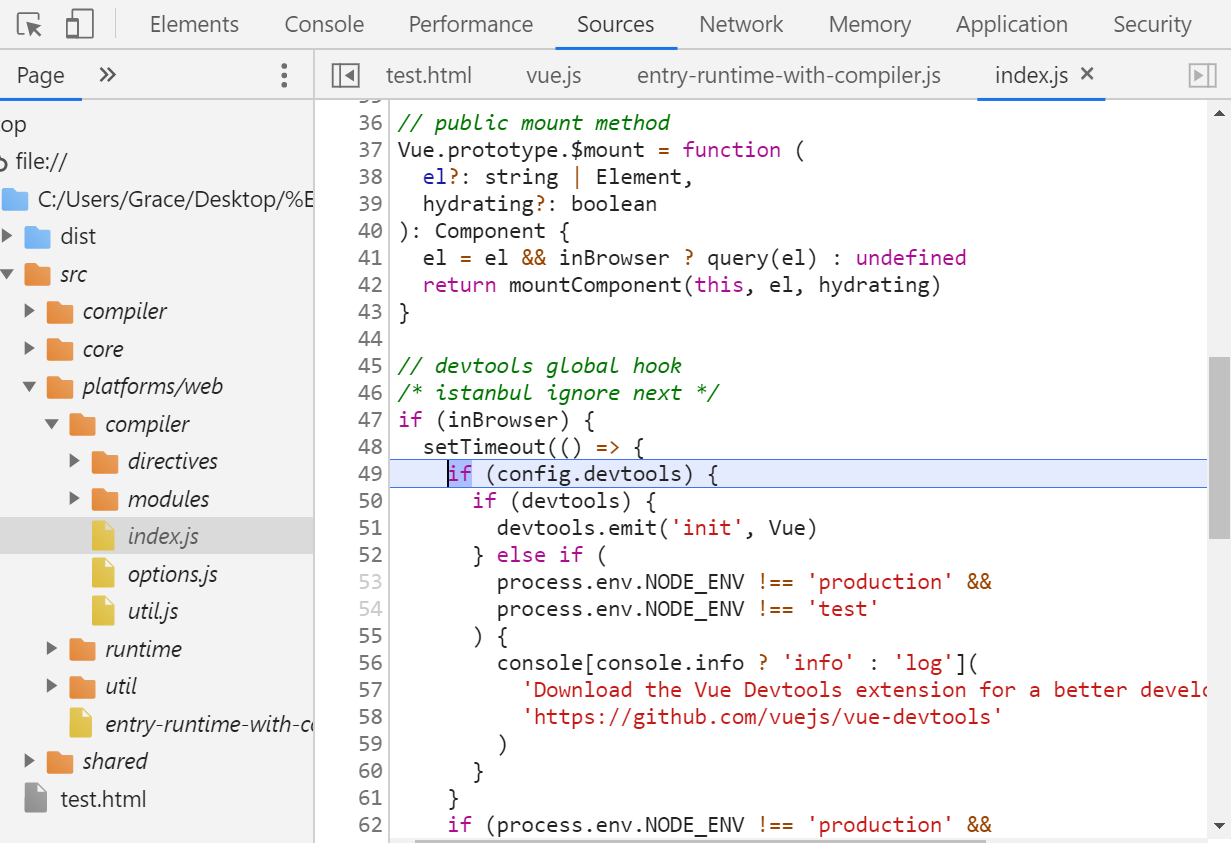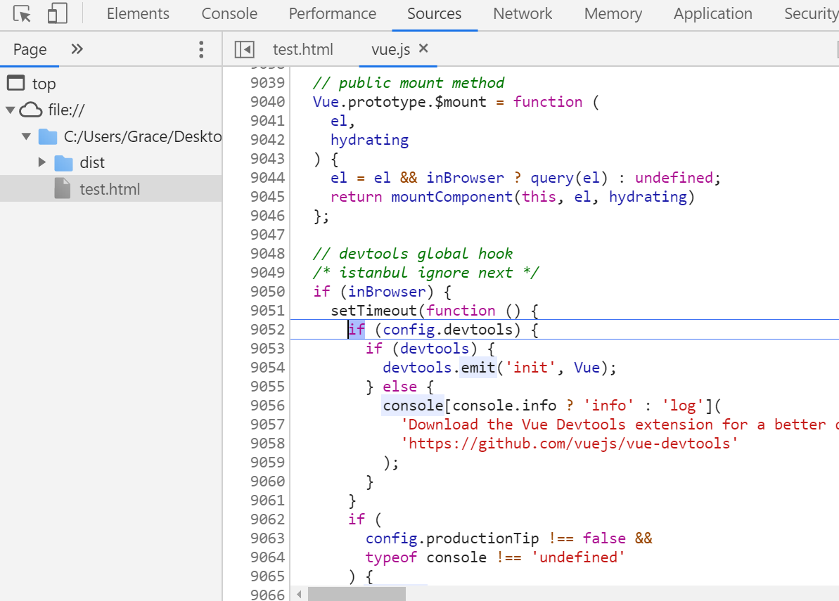 修改后重新npm run dev,就可以看到dist目录下生成了vue.js.map文件,这个时候浏览器debug就可以在src目录里的文件打断点调试了。