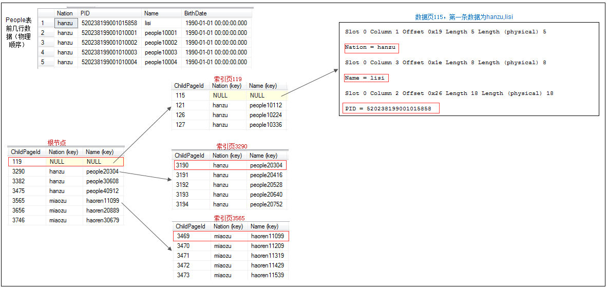 - 索引页里面包含的是索引行,索引行由索引键值和指针构成,指针指向的是下一级索引的页ID。如果下一级是数据页,则指向的就是数据页ID(不是数据行的ID)。