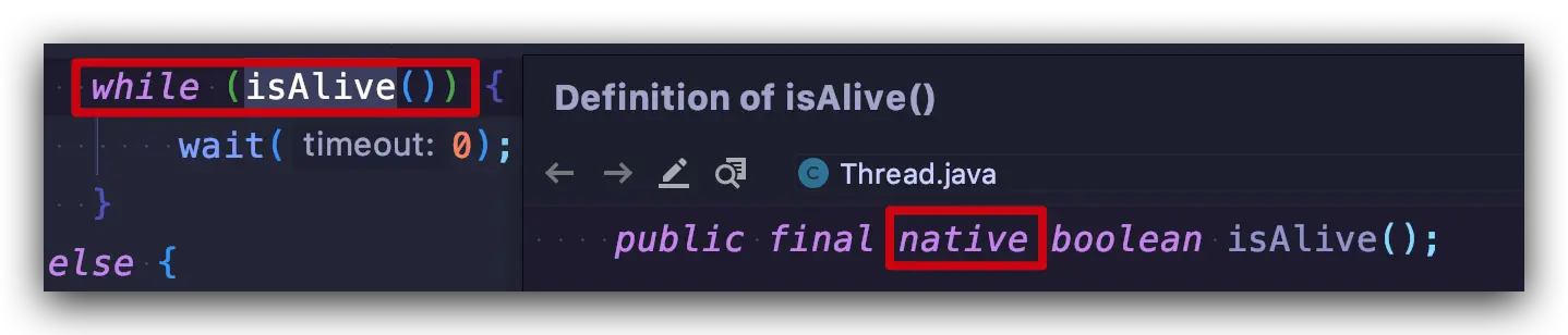 其实现原理是不停的检查 join 线程是否存活,如果 join 线程存活,则 wait(0) 永远的等下去,直至 join 线程终止后,线程的 this.notifyAll() 方法会被调用(该方法是在 JVM 中实现的,JDK 中并不会看到源码),退出循环恢复主线程执行。很显然这种循环检查的方式比较低效