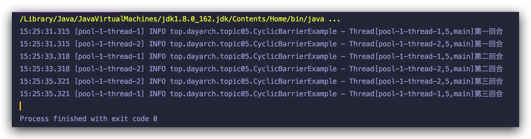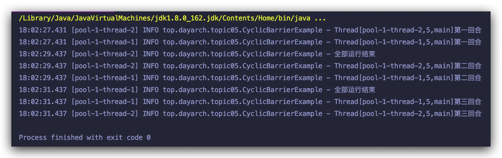 上述示例,我们构建 CyclicBarrier 对象时,并没有传递 barrierCommand 对象, 我们修改示例传入一个 barrierCommand 对象,看看会有什么结果: