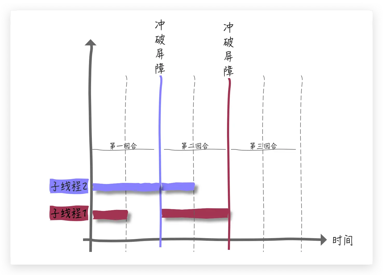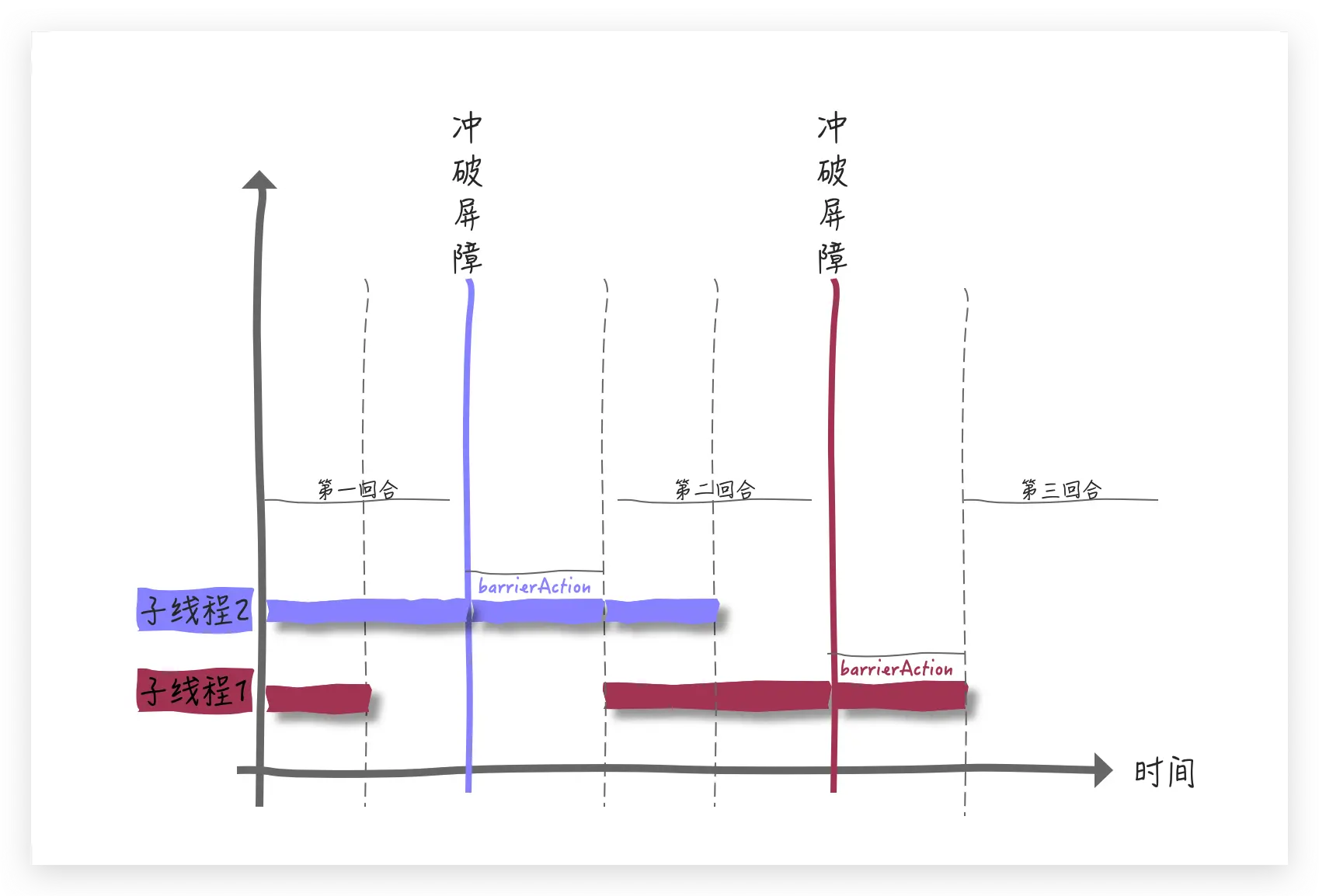 从运行结果中来看,每次冲破屏障后都会执行 CyclicBarrier 初始化 barrierCommand 的方法, 这与我们对 doWait() 方法的分析完全吻合,从上面的运行结果中可以看出,最后一个线程是运行 barrierCommand run() 方法的线程,我们再来形象化的展示一下整个过程