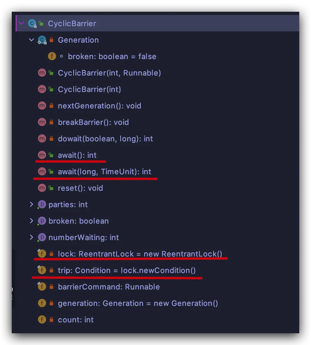 doWait 就是 CyclicBarrier 的核心逻辑, 可以看出,该方法入口使用了 ReentrantLock,这也就是为什么 Generation broken 变量没有被声明为 volatile 类型保持可见性,因为对其的更改都是在锁的内部,同样在锁的内部对计数器 count 做更新,也保证了原子性