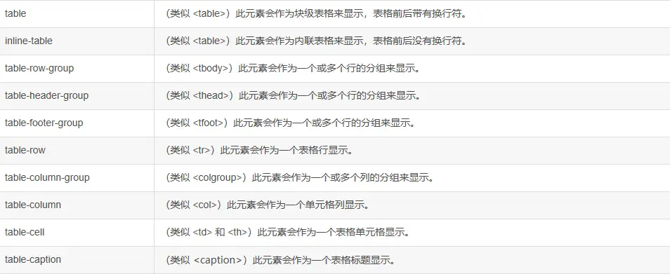 display:table系列几乎是和table系的元素相对应的,请看下表: