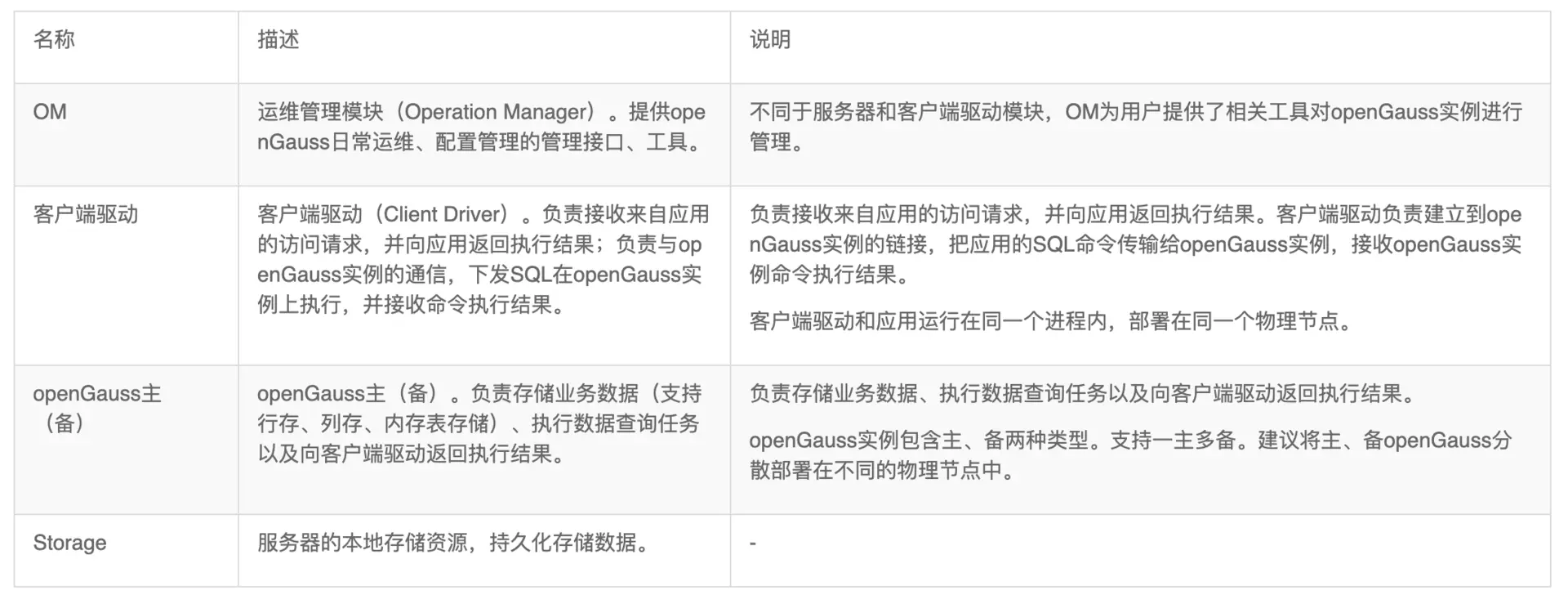 openGauss主要包含了openGauss服务器,客户端驱动,OM等模块。