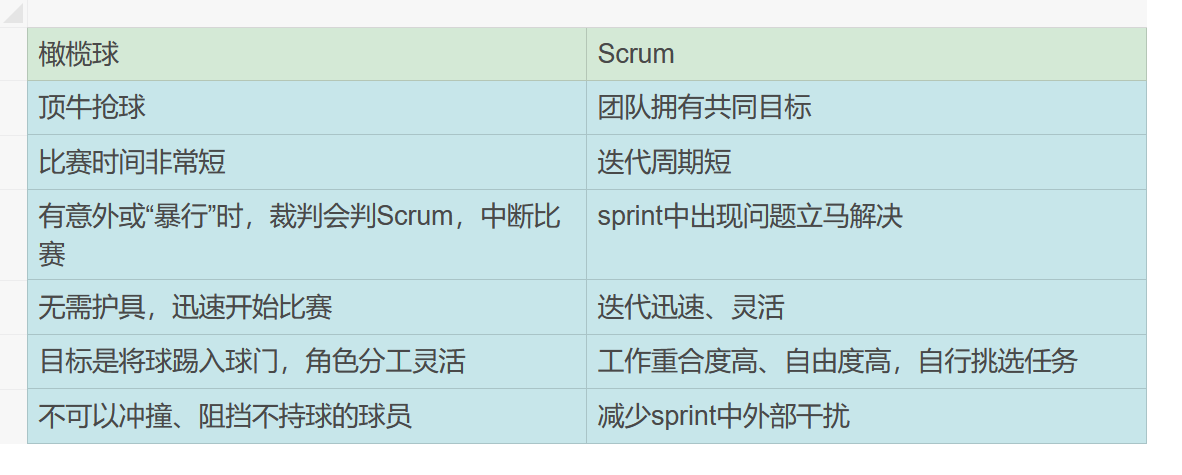 读到这里是不是若有所思?没错,Scrum开发模式并不只是简单地借用了英式橄榄球的术语,许多精神也与之一脉相承,二者的许多元素都可一一对应。
