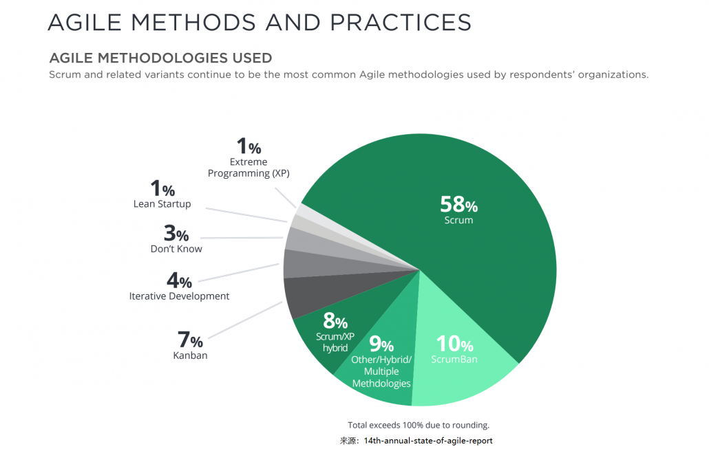 至今,根据《2020敏捷状态调查报告》,总共有76%的组织采用Scrum,Scrum已成为当之无愧的“C位”开发模式。