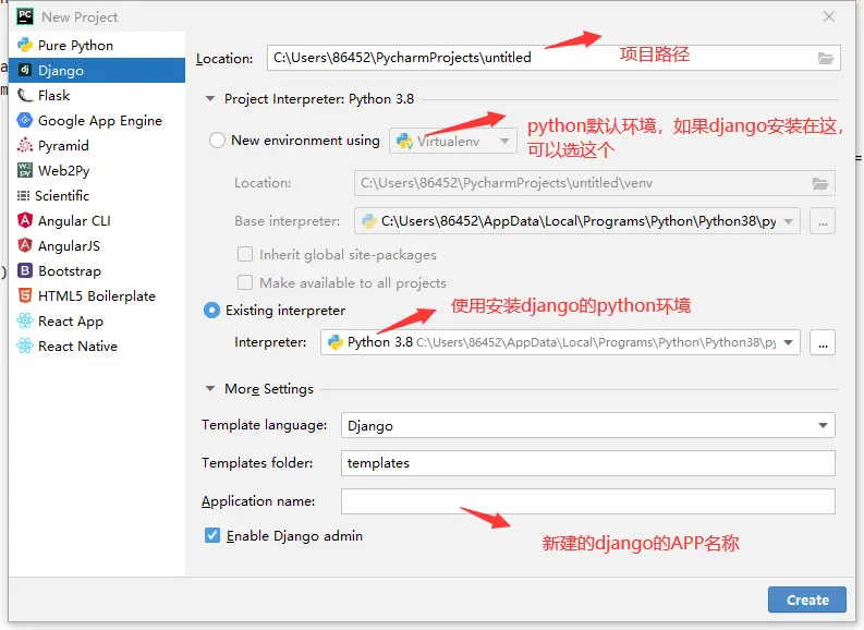 也可以在pycharm创建项目时,就一起创建好,pycharm给我们提供了这样的功能。