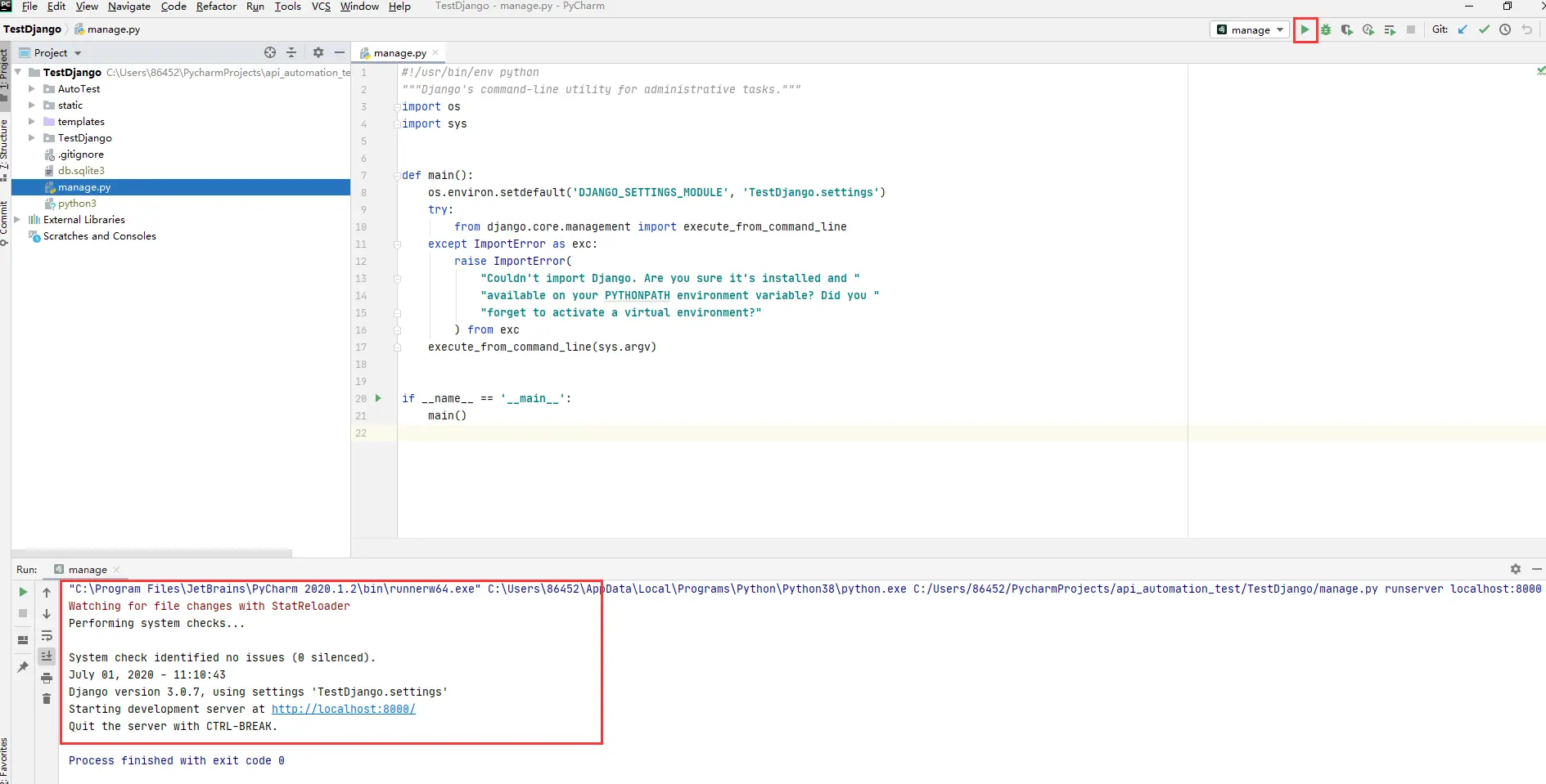 C:\Users\86452\PycharmProjects\TestDjango> C:/Users/86452/PycharmProjects/APPtest/venv/Scripts python manage.py runserver
