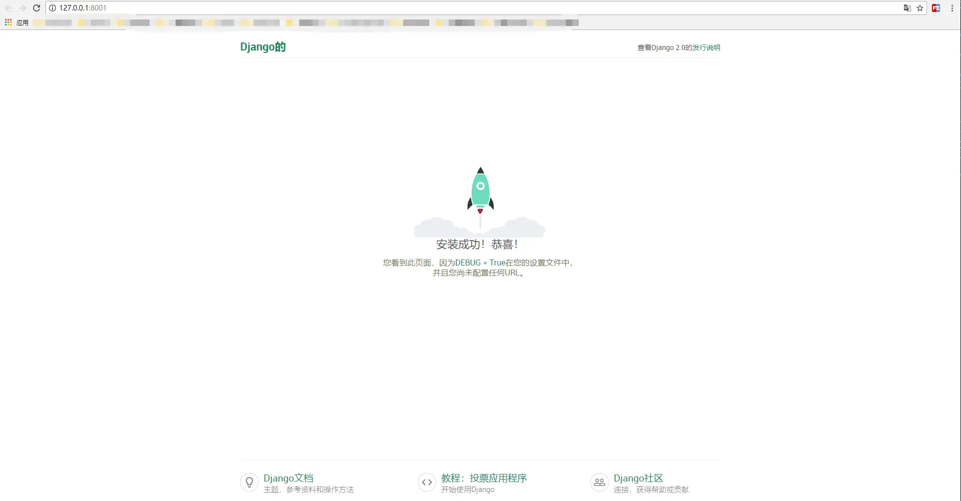 然后打开浏览器,输入127.0.0.1:8000,出现一个恭喜你的小火箭,就是启动成功啦