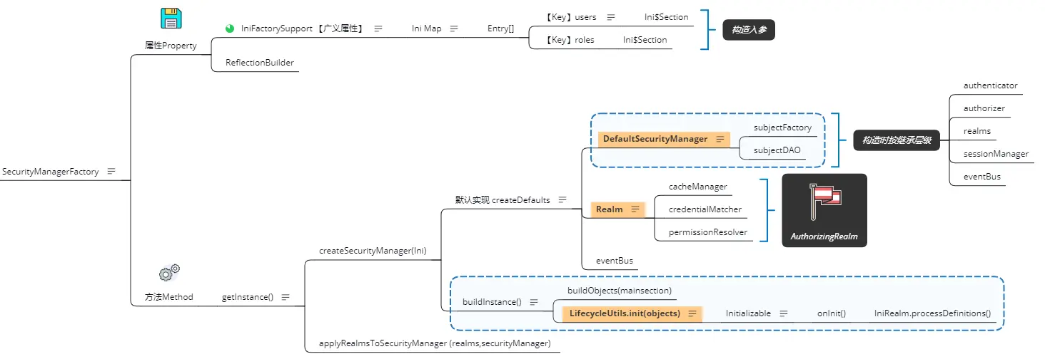 SecurityManager采用工厂模式构造,其中需注意的是Initializable这个接口,LifeCycleUtils会调用onInit方法对realm进行解析和必要初始化;