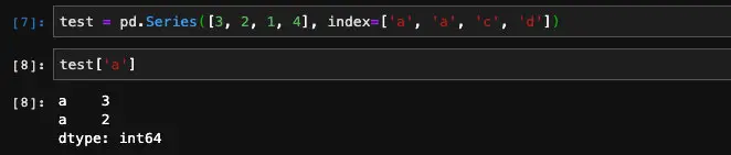 另外在创建Series的时候,重复的索引也是允许的。同样当我们使用索引查询的时候也会得到多个结果。