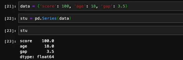 Series有索引也有值,其实和dict的存储结构是一样的,所以Seires也支持通过一个dict来初始化: