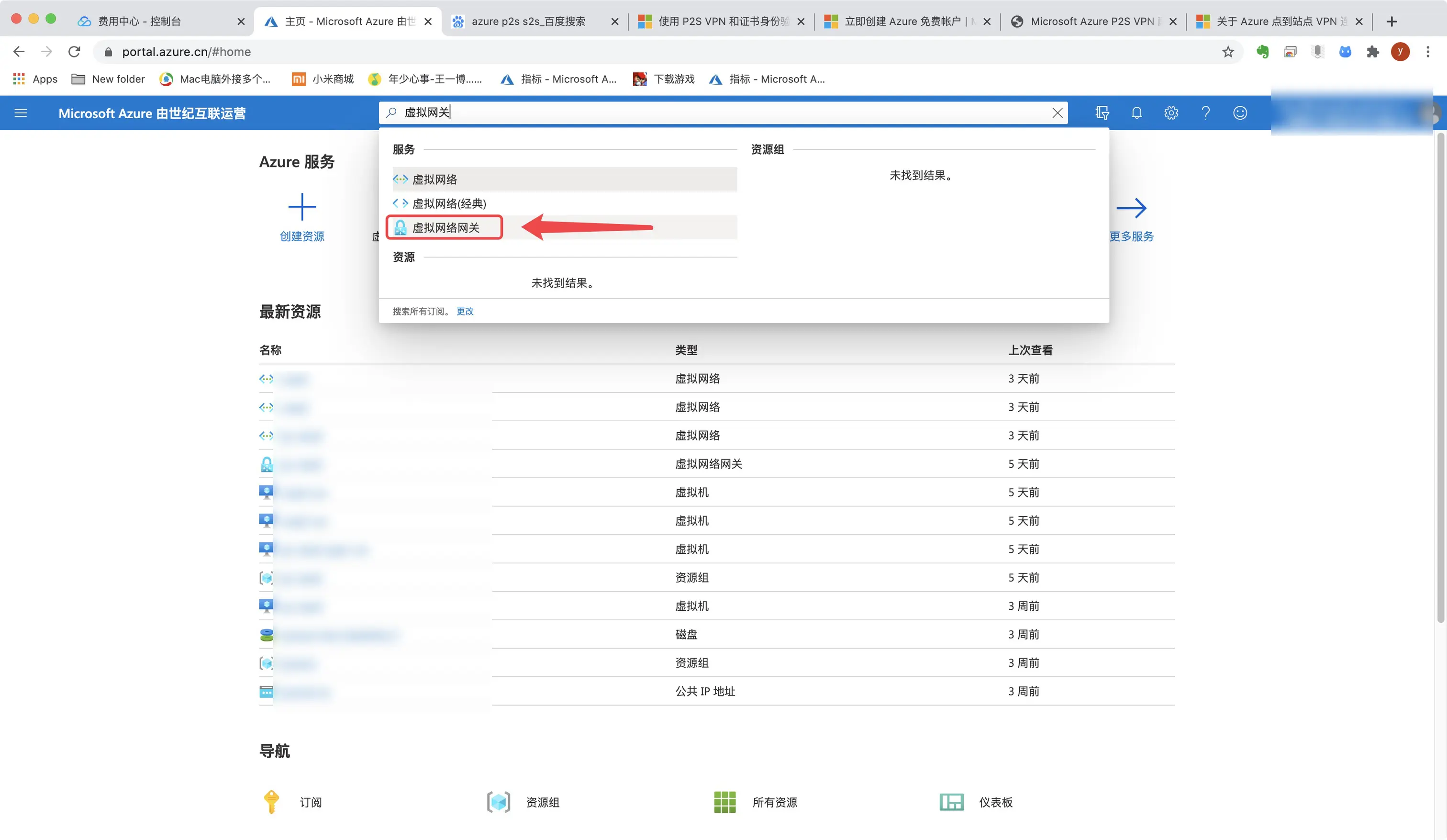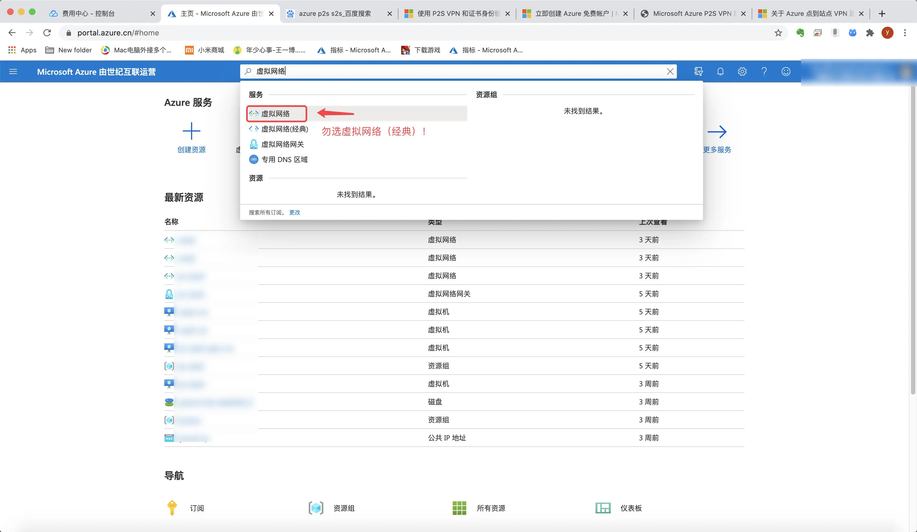 1.进入Azure首页,点击或搜索“虚拟网络”。请勿选择”虚拟网络(经典)”。