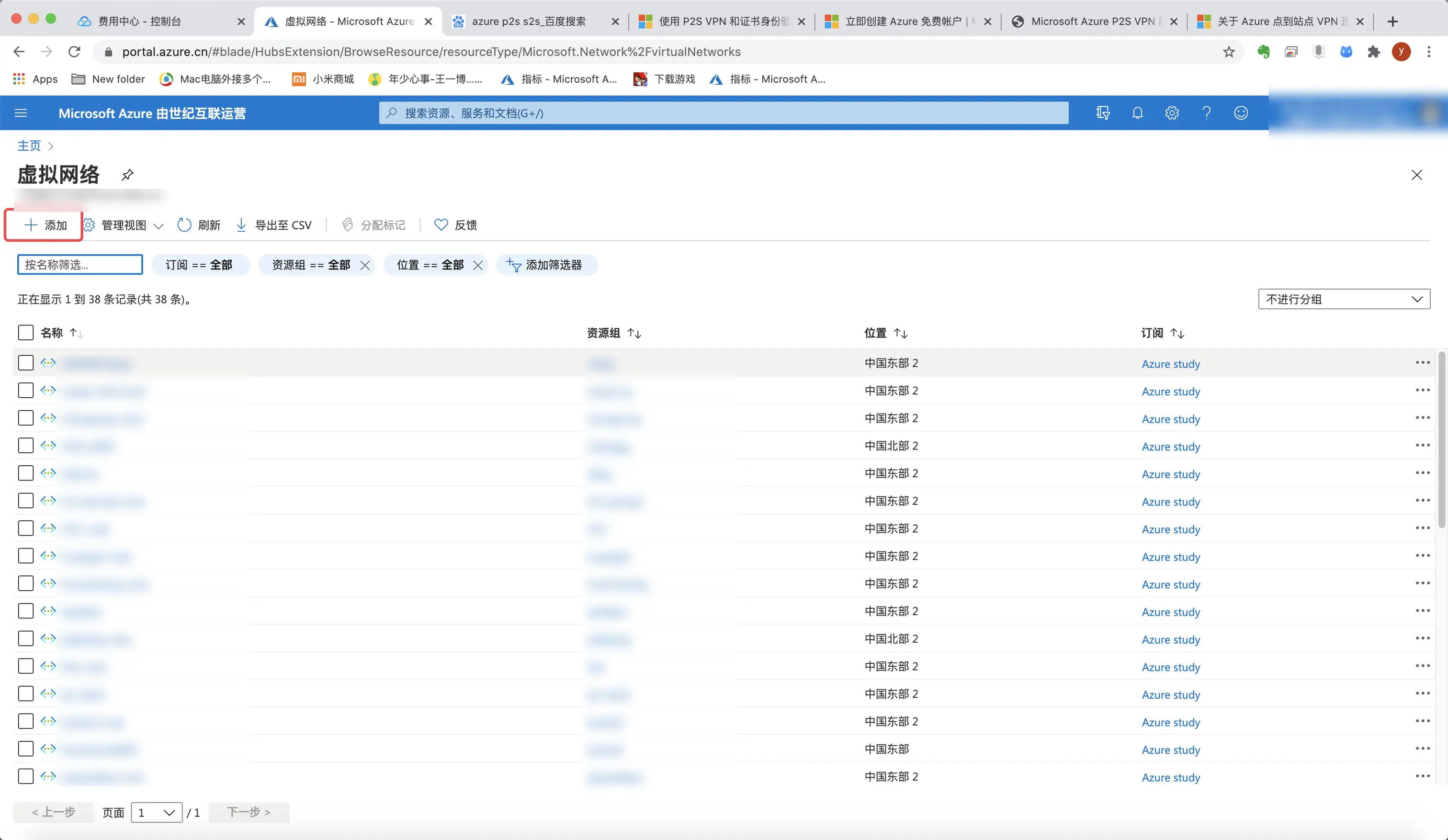 2.点击"添加",创建虚拟网络。