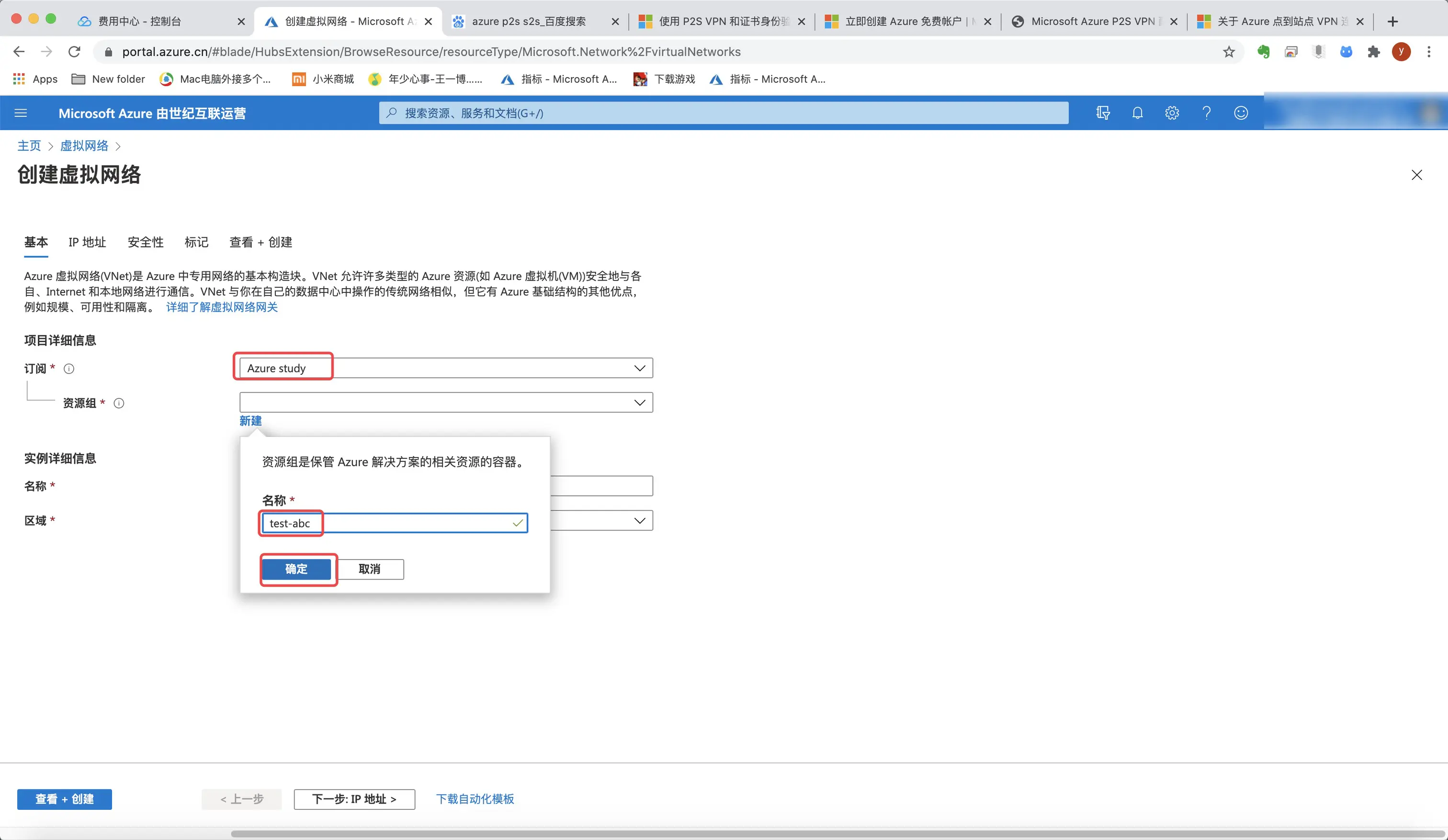 3.选择一个订阅和资源组,若无请创建。这里我创建了一个Azure Study的订阅和test-abc的资源组。(资源组是存放本资源组创建的所有资源的,类似文件夹)