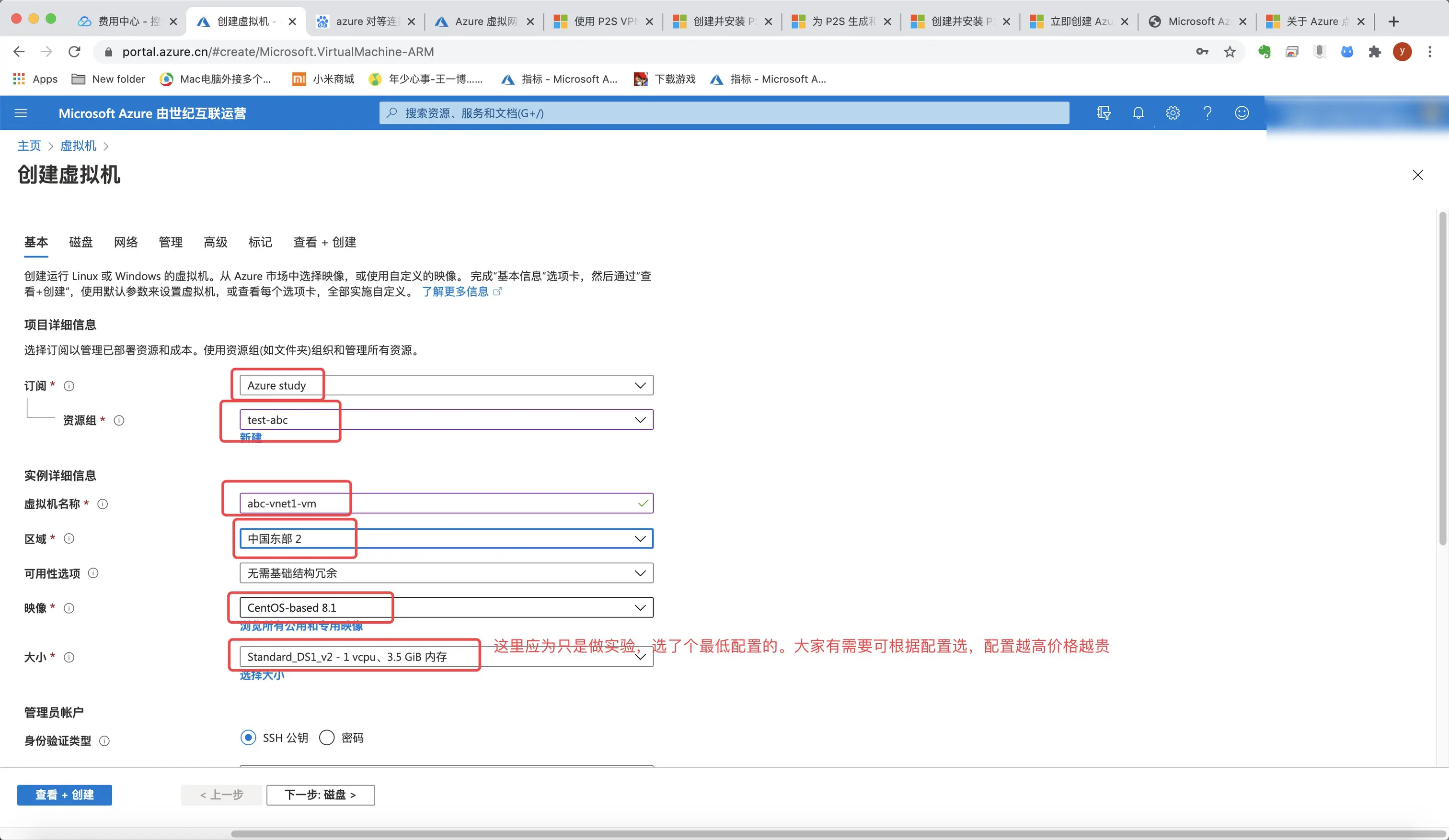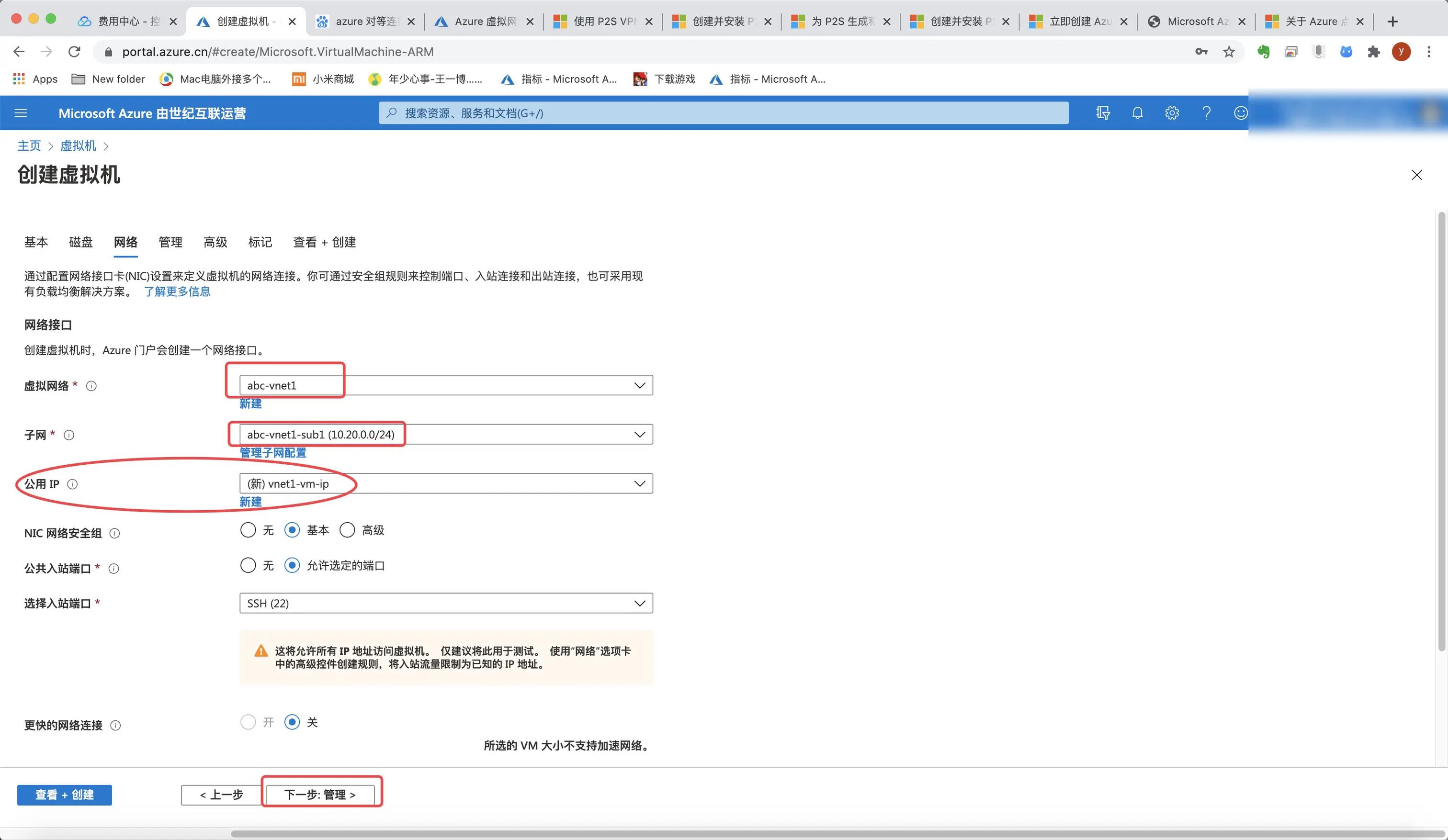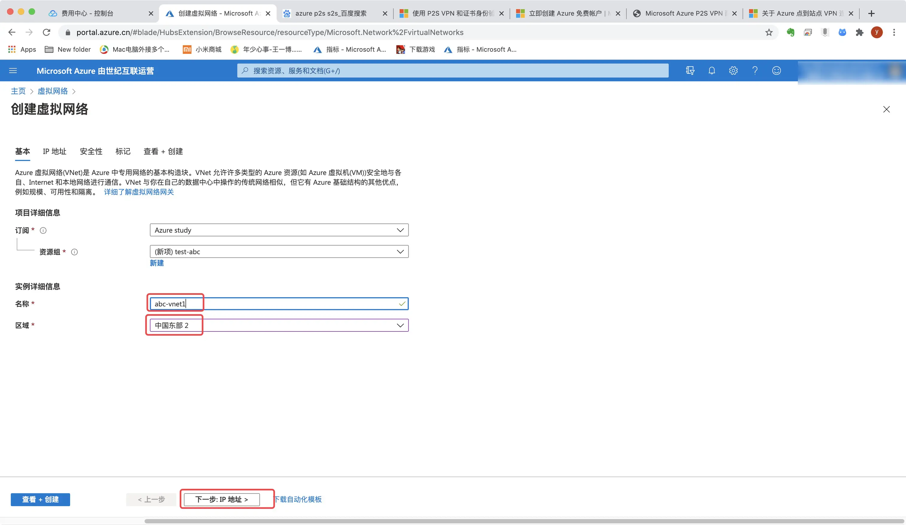 4.给虚拟网络命名,这里我命名为abc-vnet1,区域我选择中国东部2。