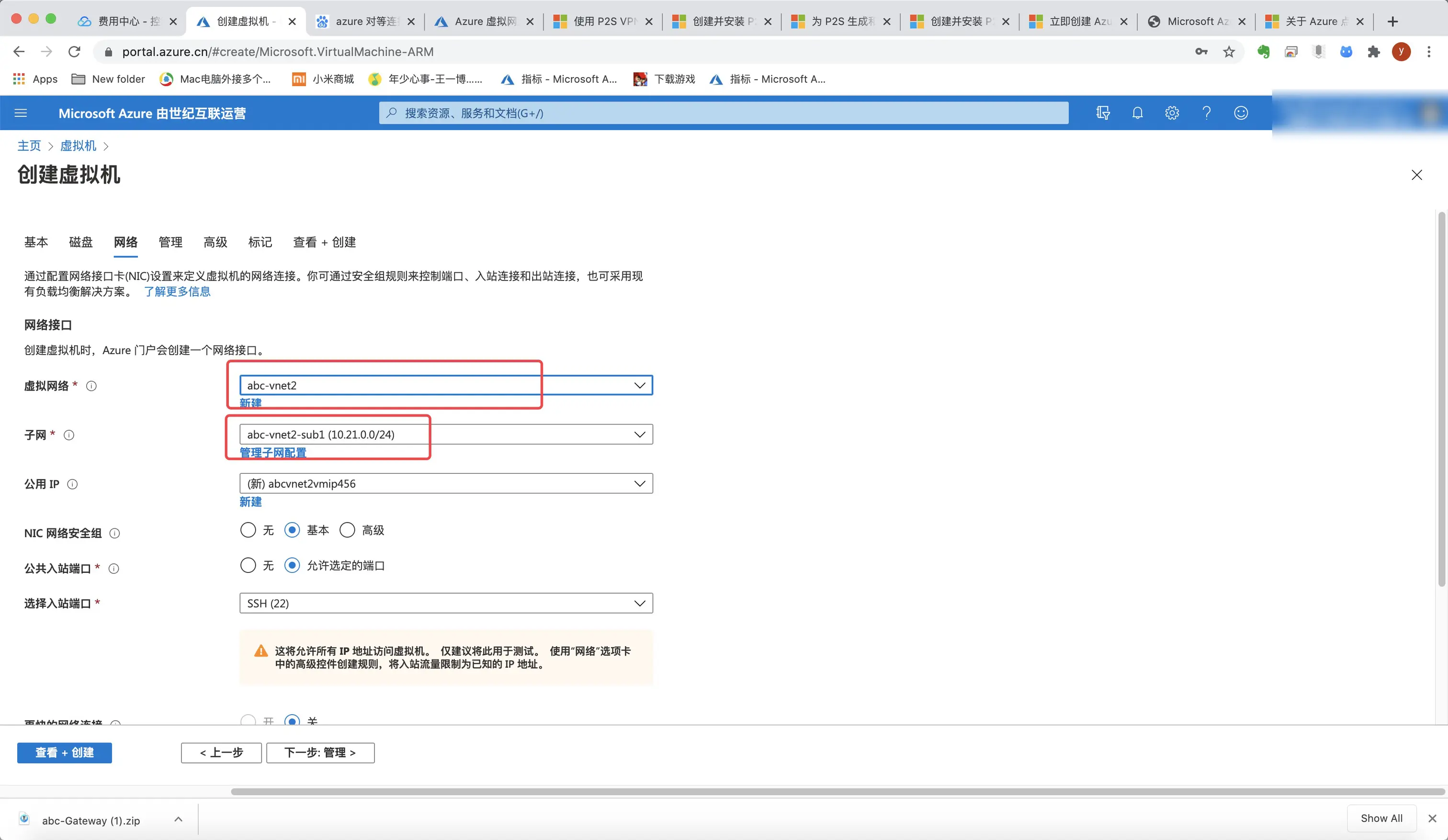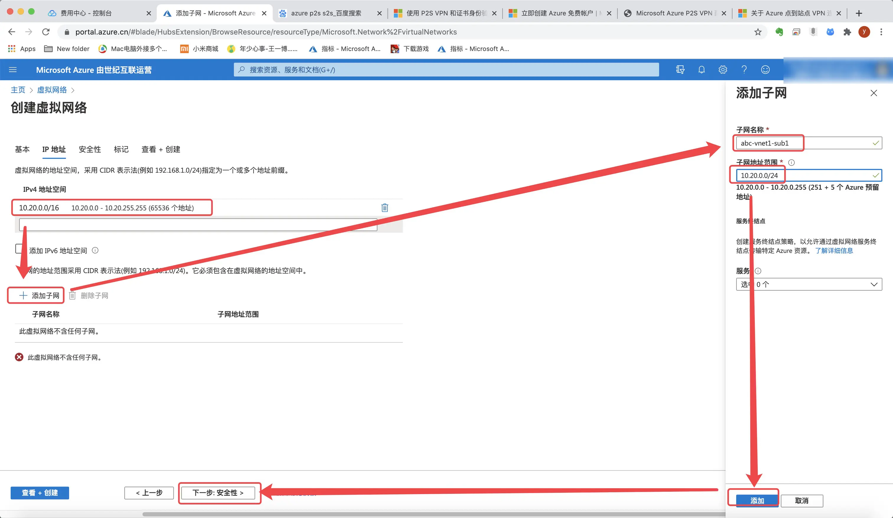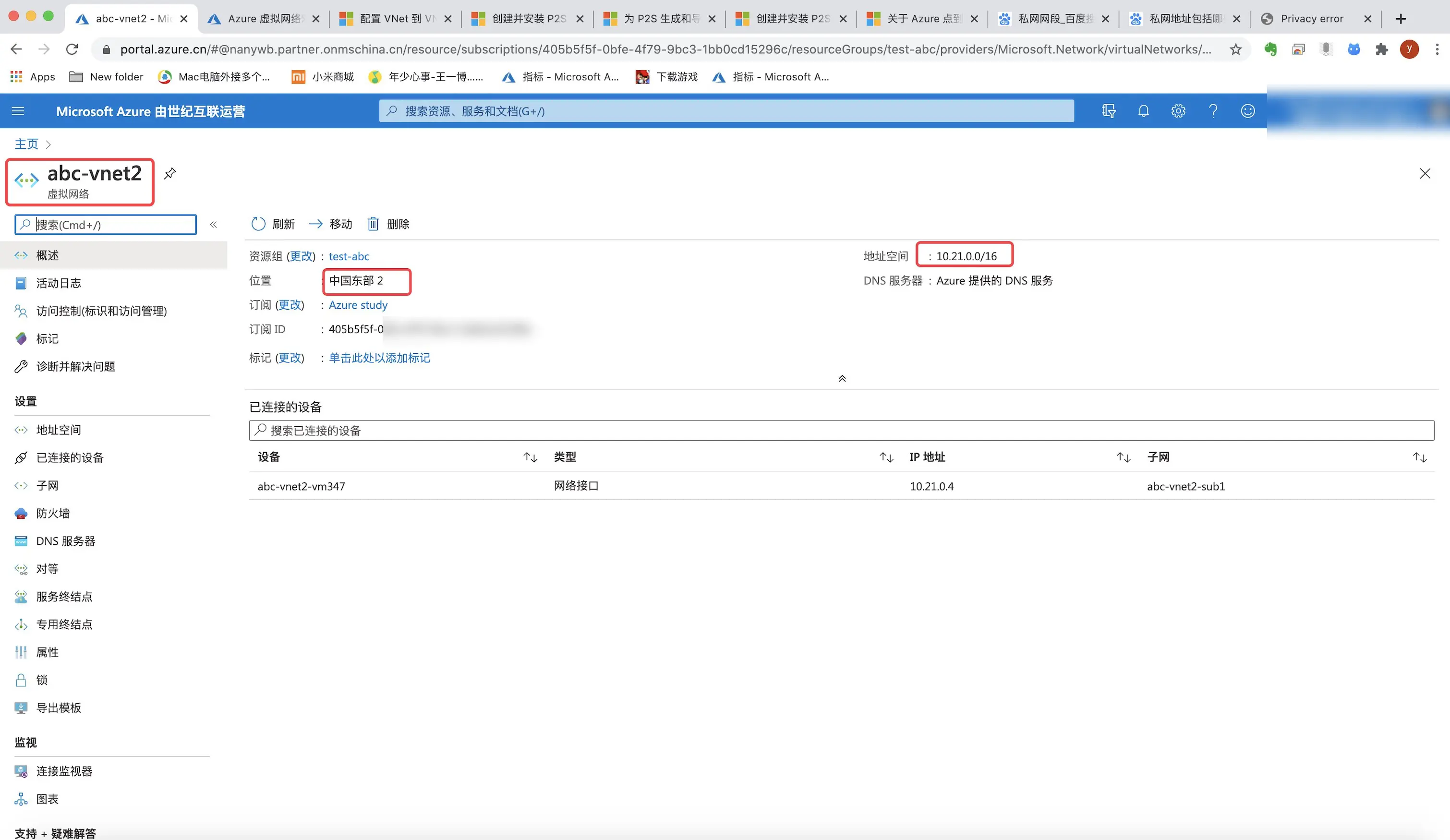 8.同样的方式再创建一个abc-vnet2,网段我选择10.21.0.0/16,不能与之前创建的abc-vnet1重复。