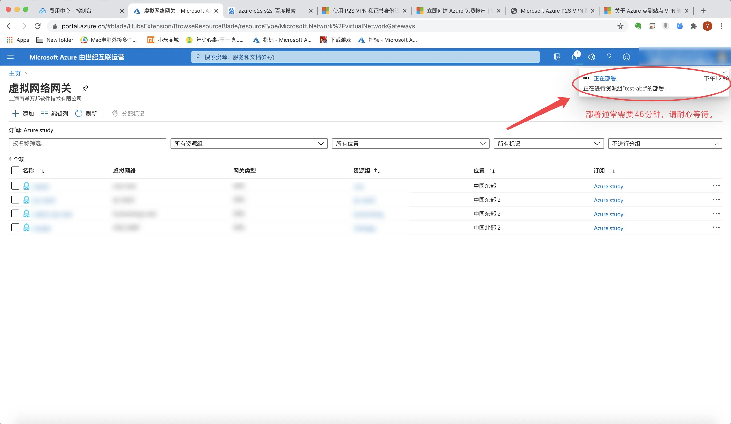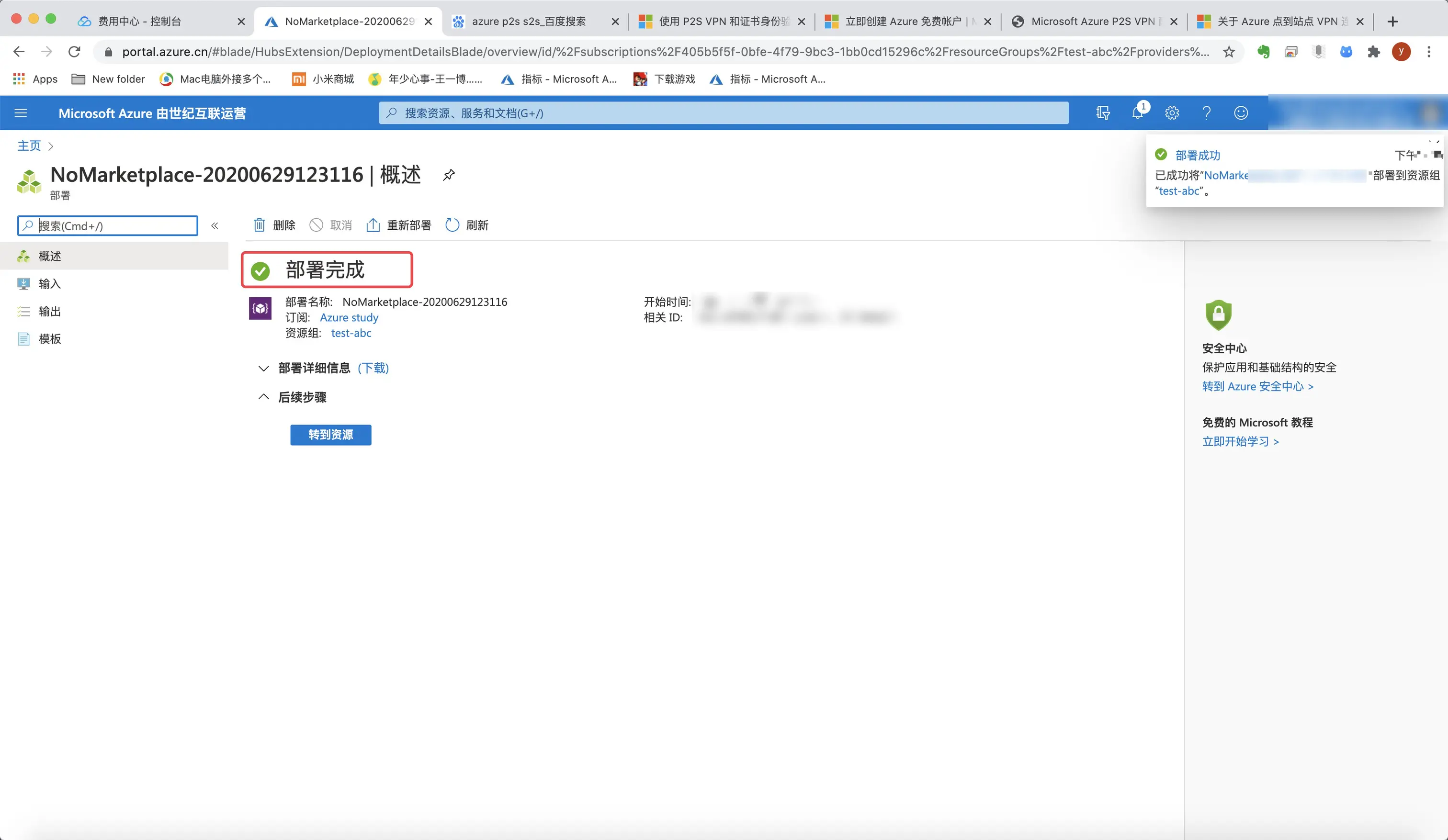 7.等待一会儿,显示部署完成,说明成功创建abc-vnet1。M
