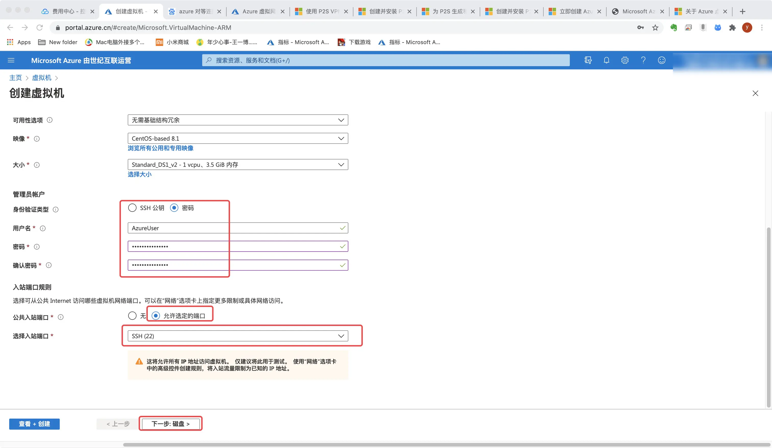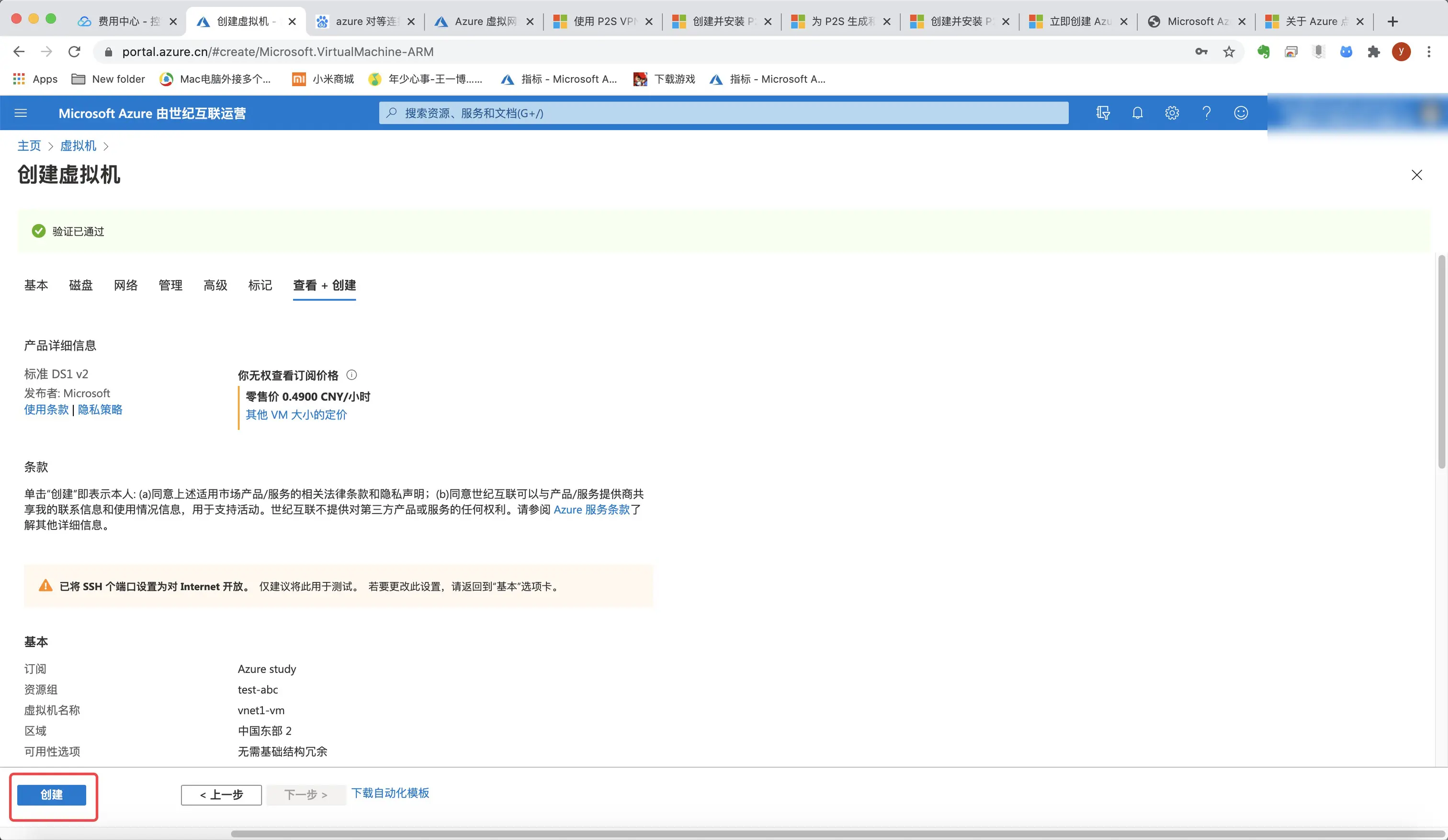 6.[安全组]和[标记]保持默认,点击下一步即可。最后确认无误后点击“创建”。
