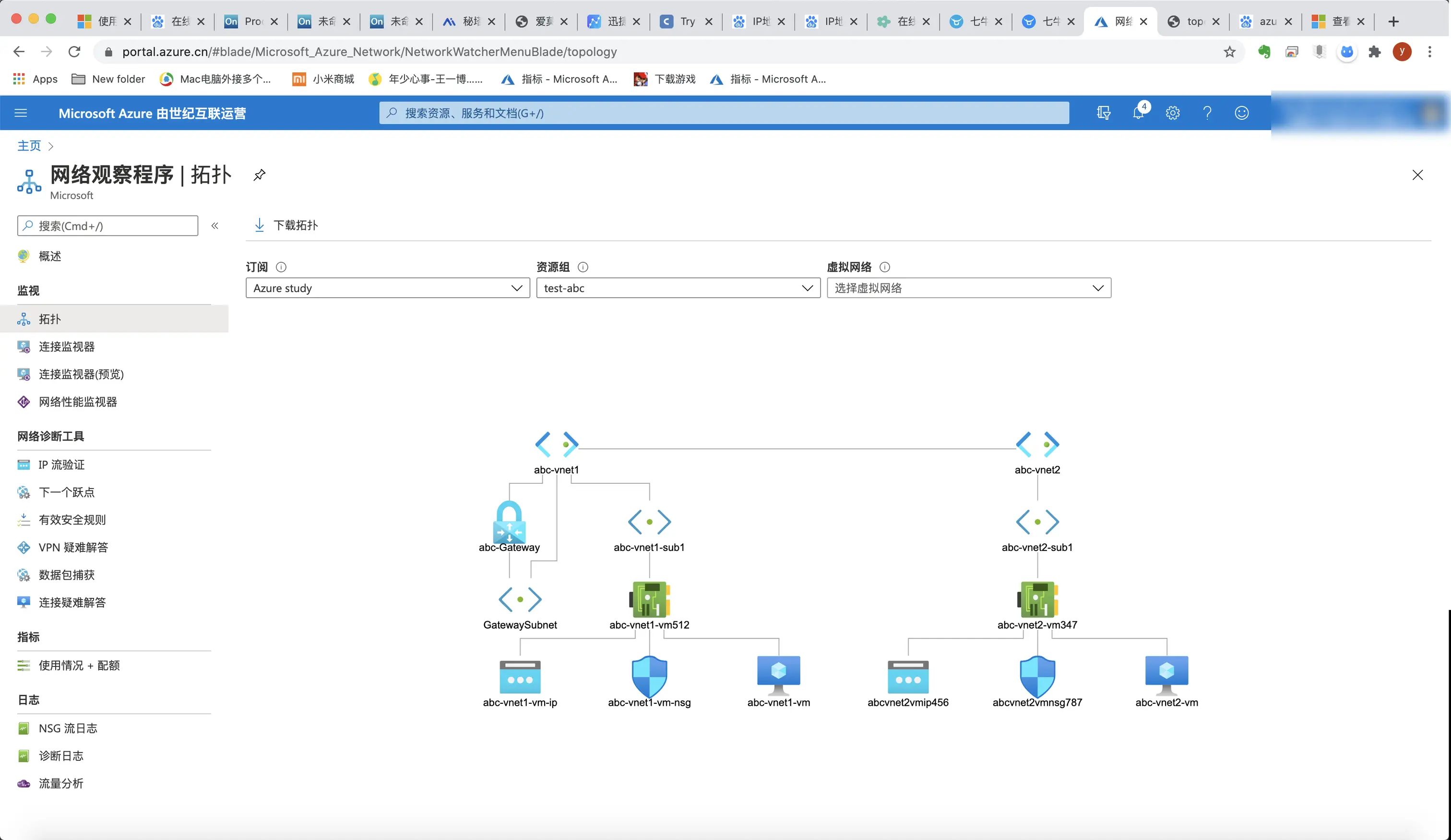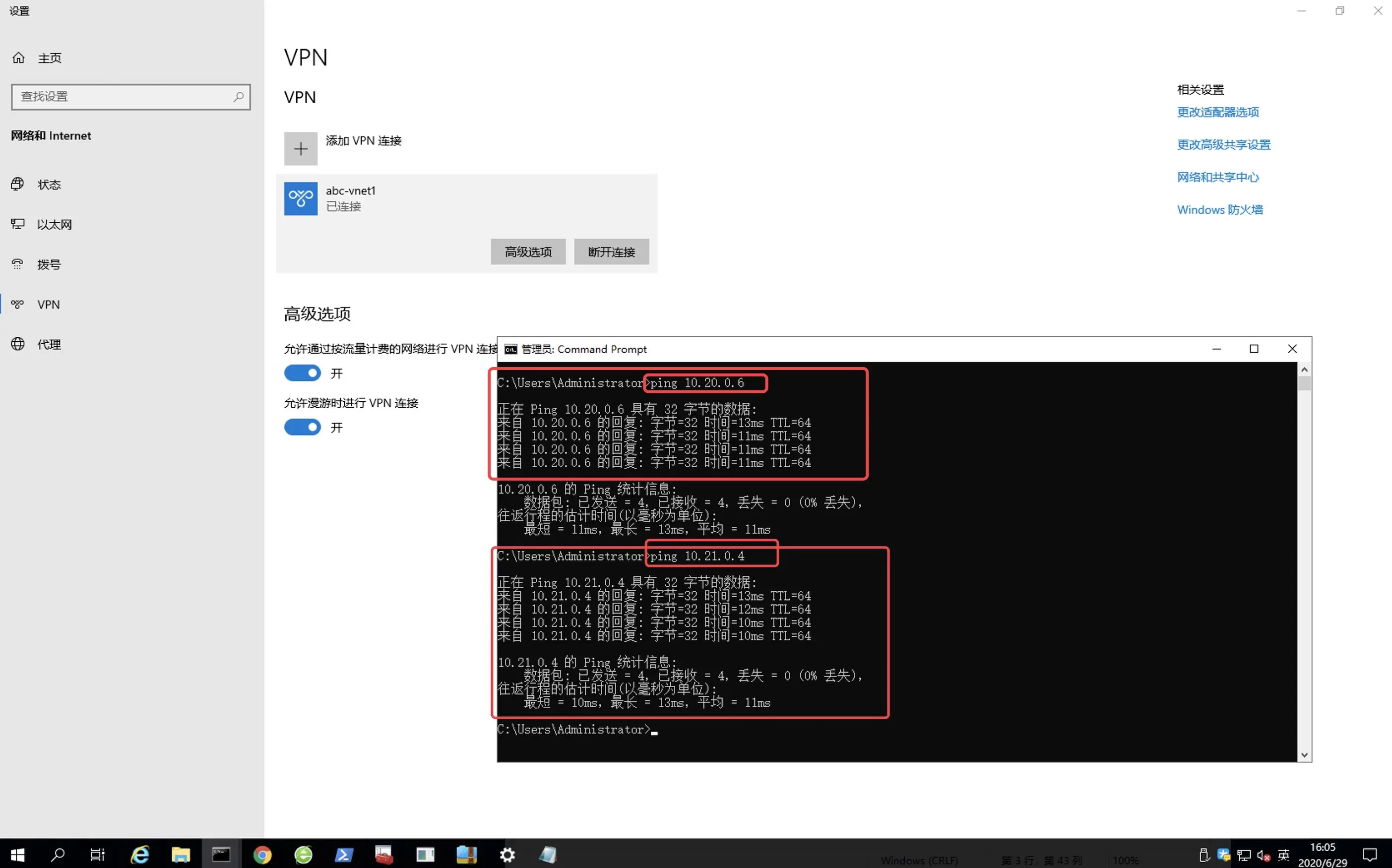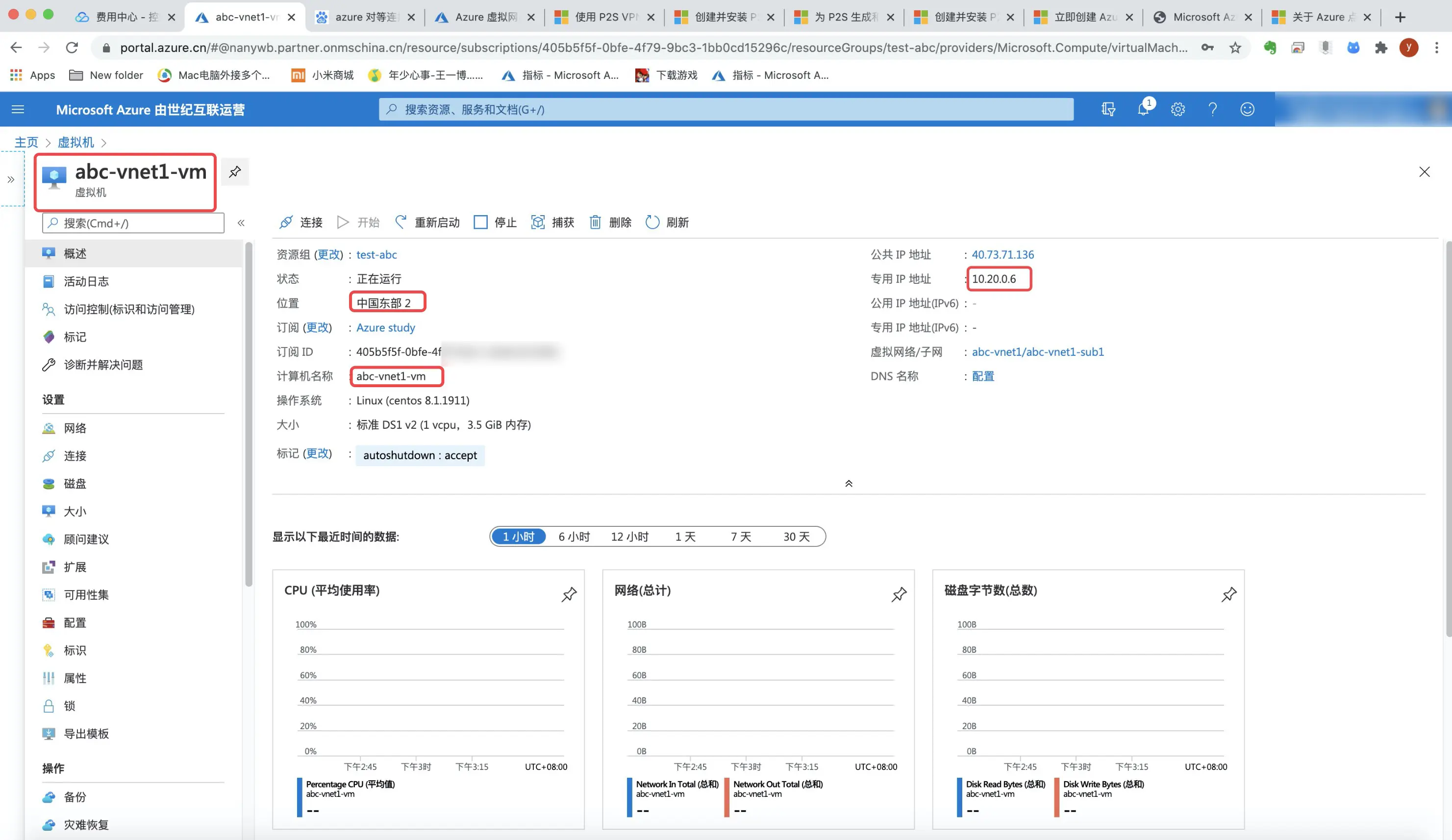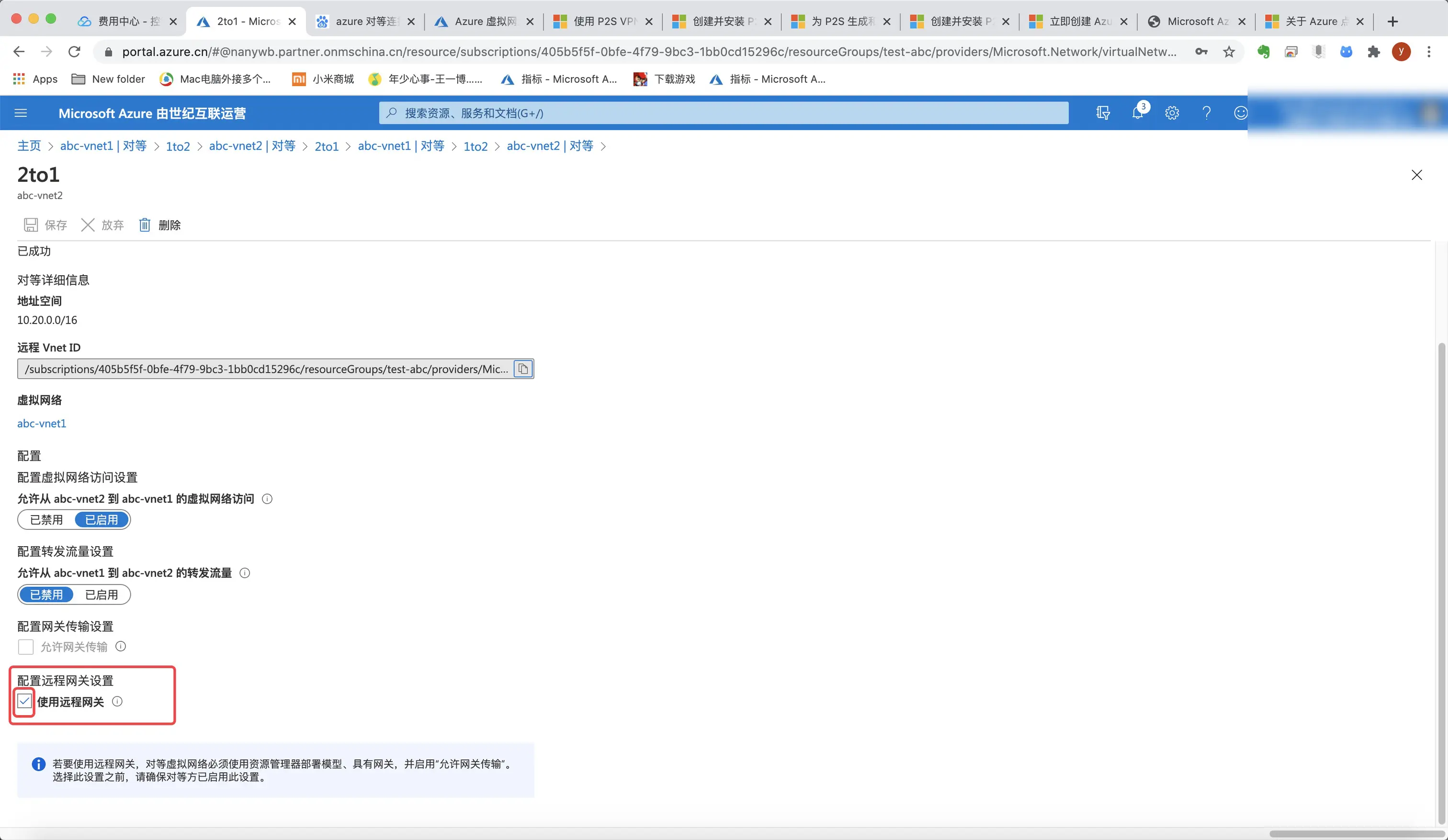 10.20.0.6和10.21.0.4都成功ping通,说明已经成功打通本机到abc-vnet1,abc-vnet1到abc-vnet2,本机直接到vnet2的道路。