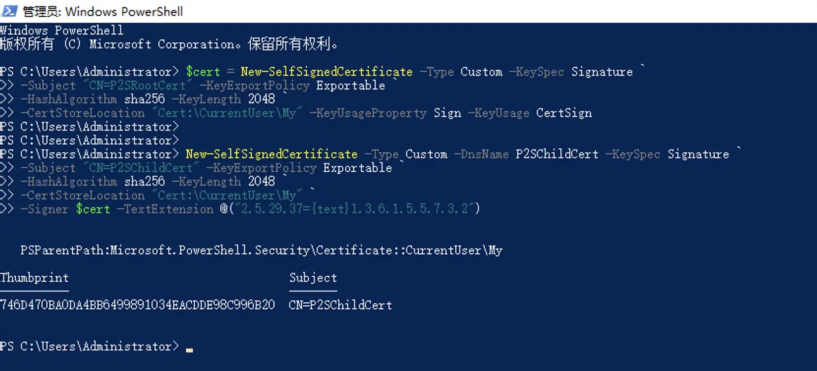 New-SelfSignedCertificate -Type Custom -DnsName P2SChildCert -KeySpec Signature `