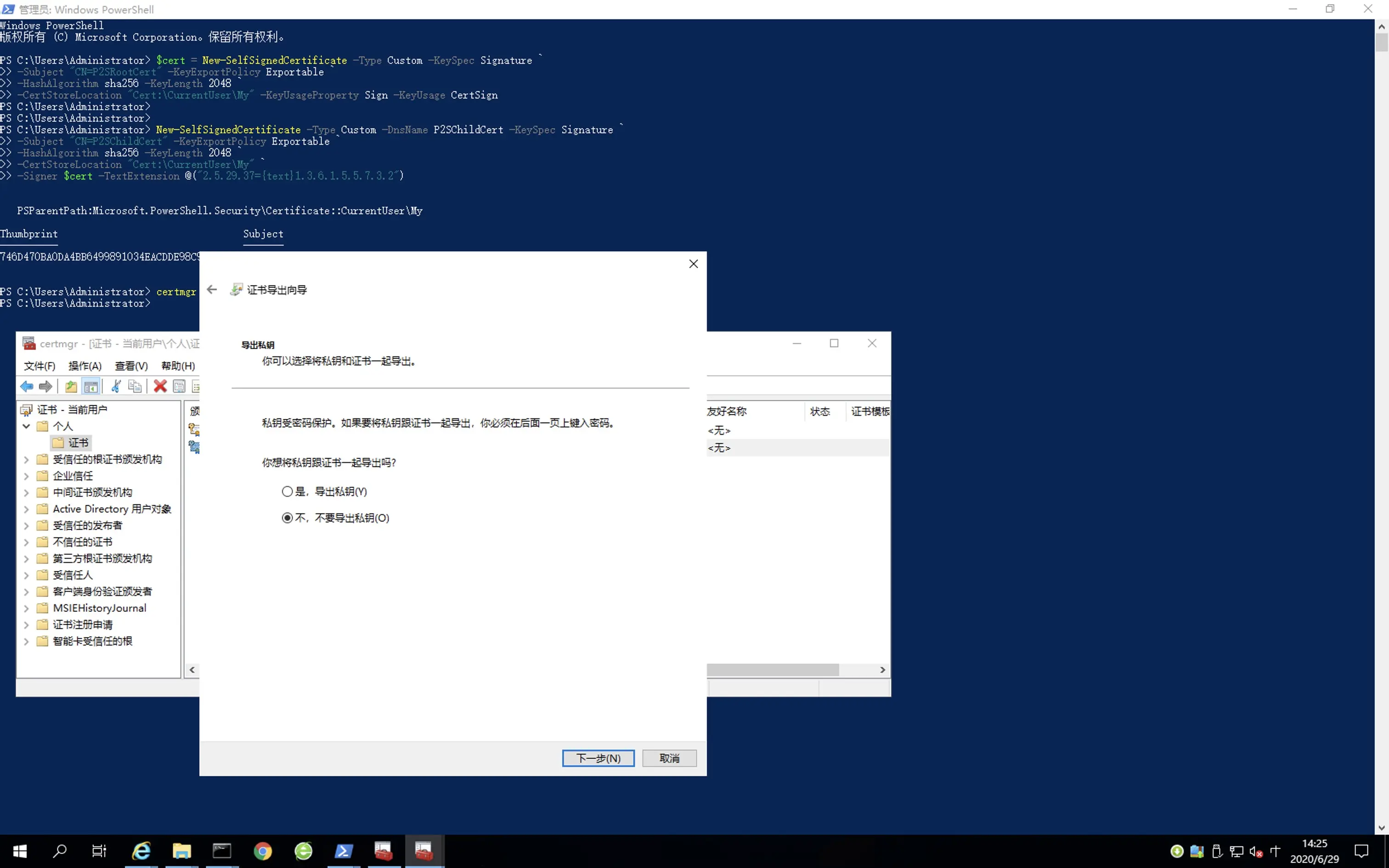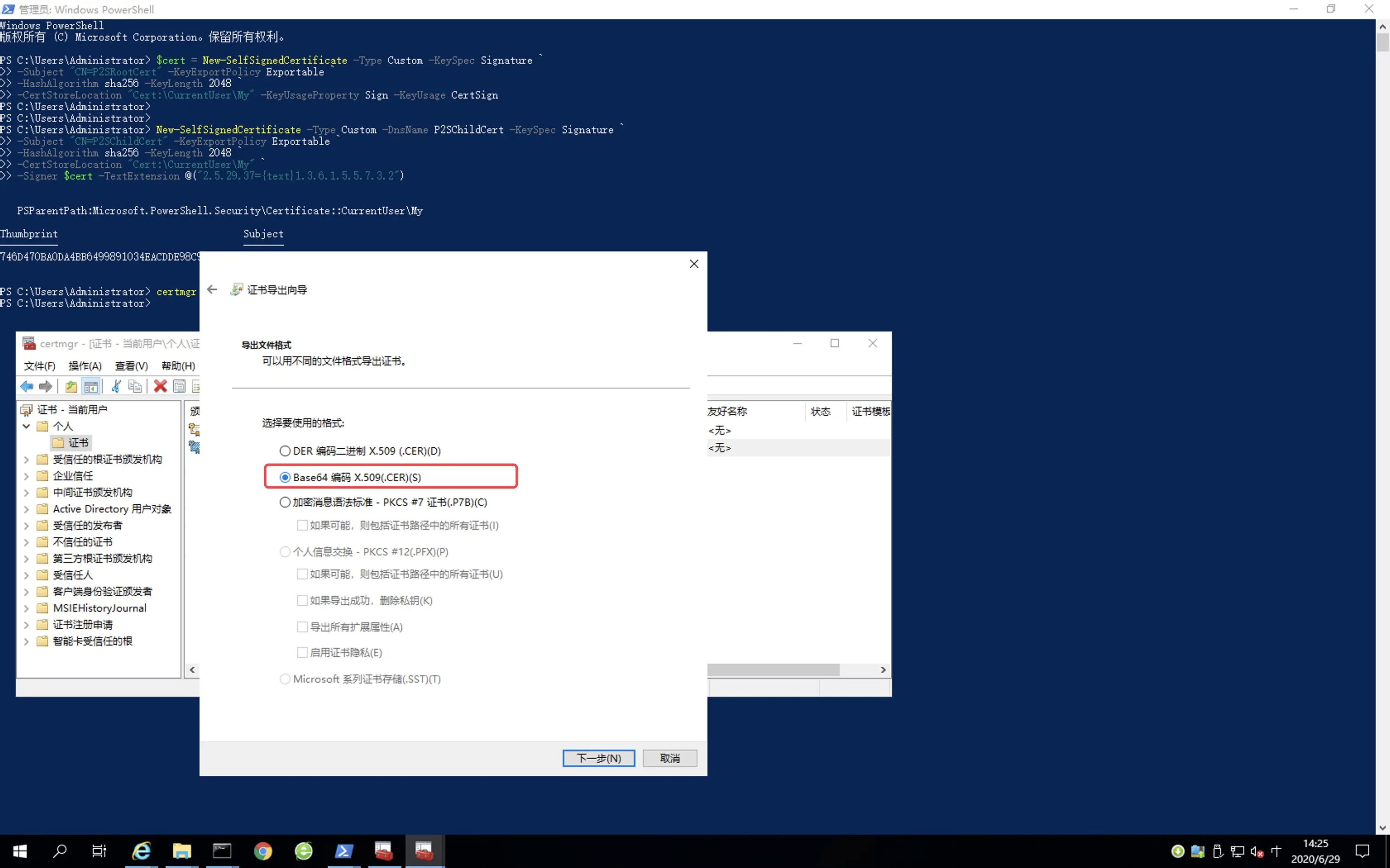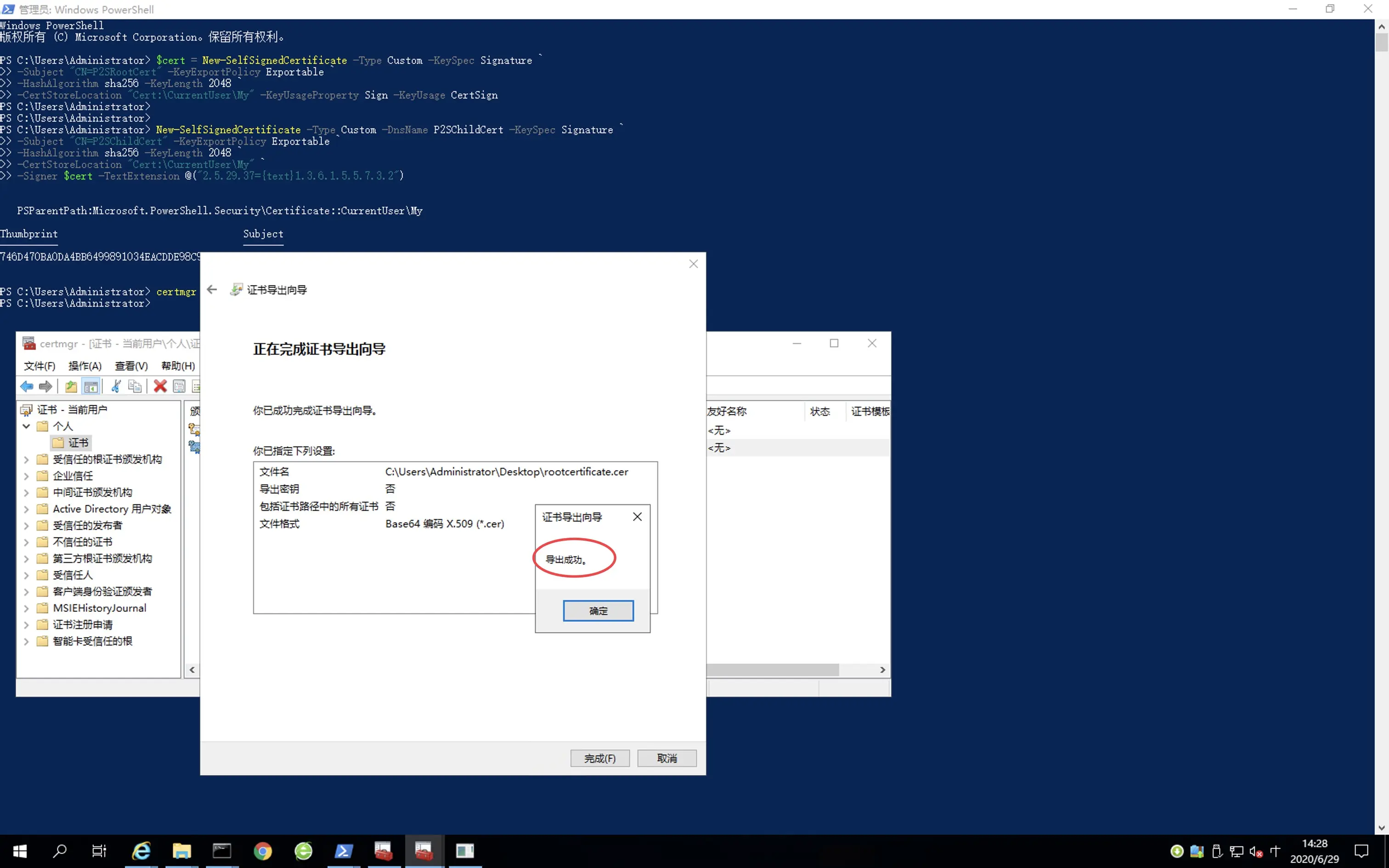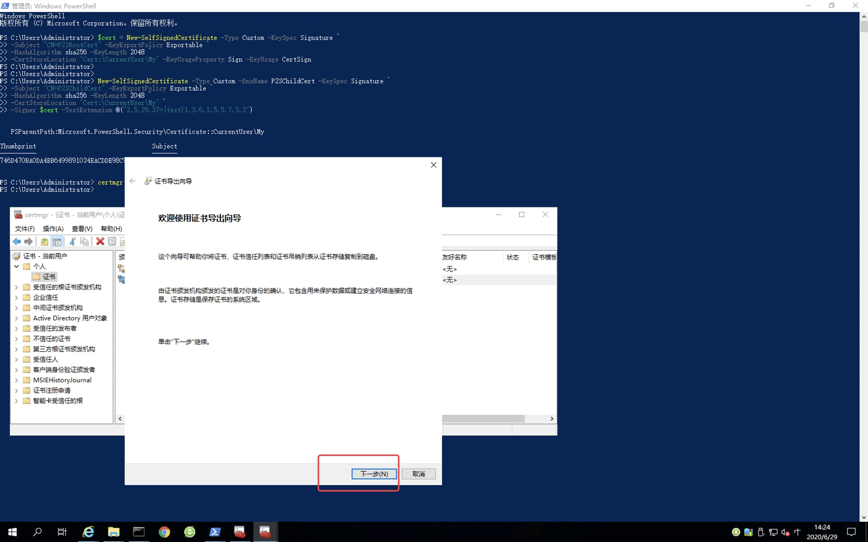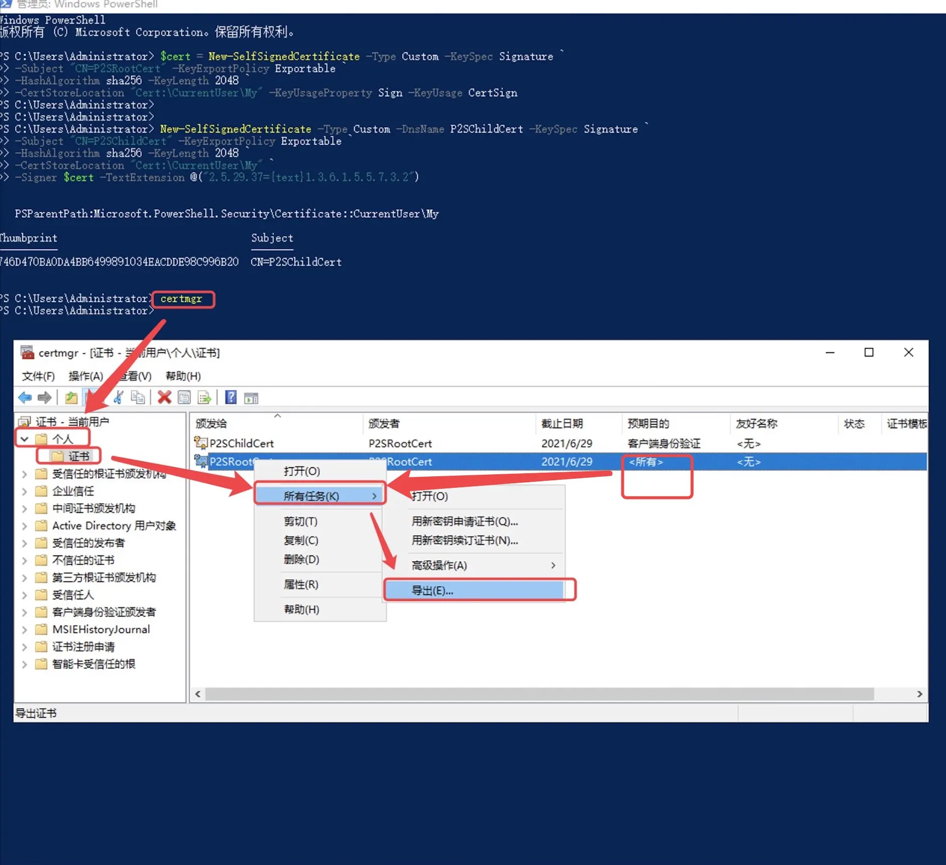 27.使用 PowerShell 键入“certmgr” 。会打开证书程序。按照如图所示顺序进行操作。