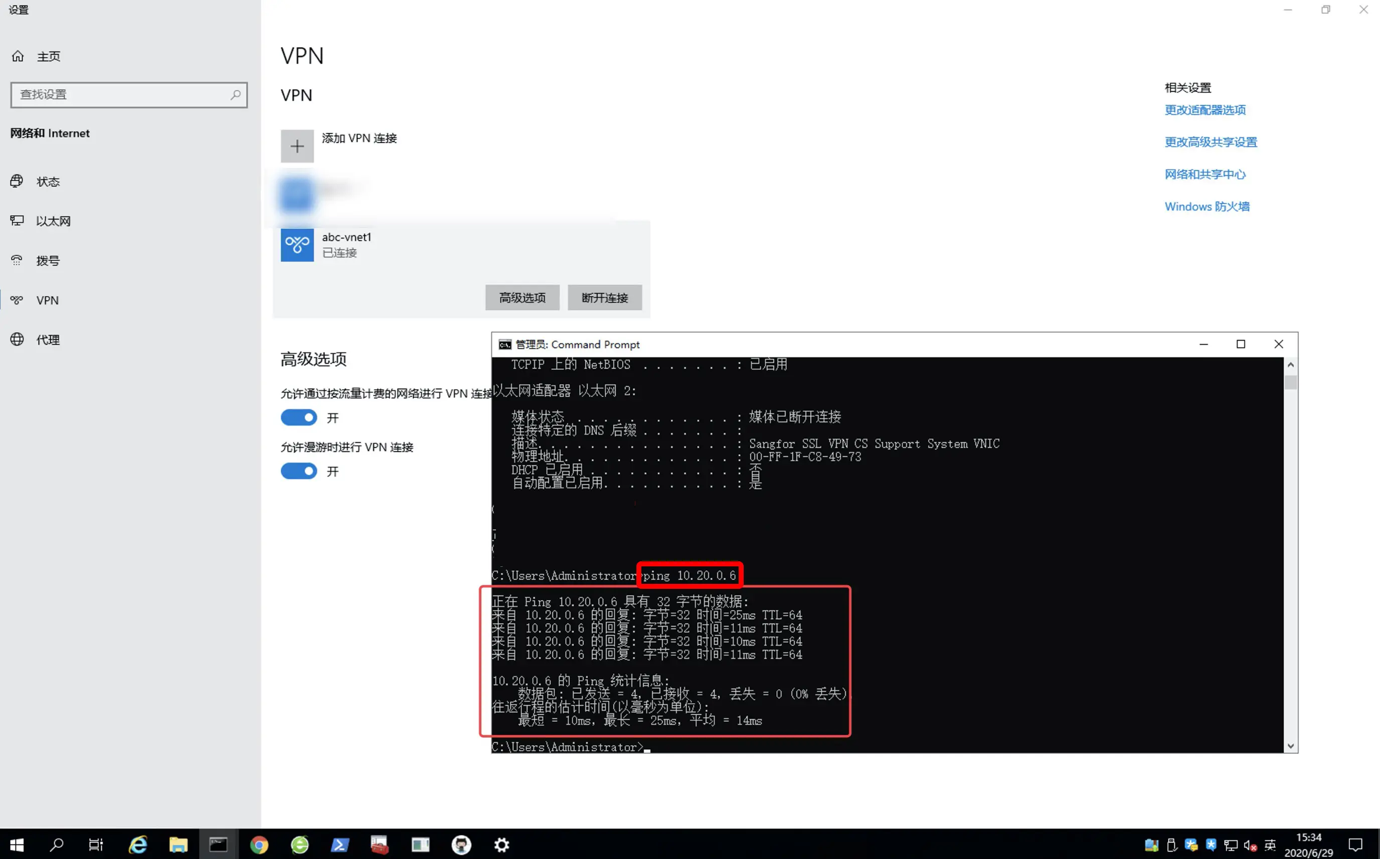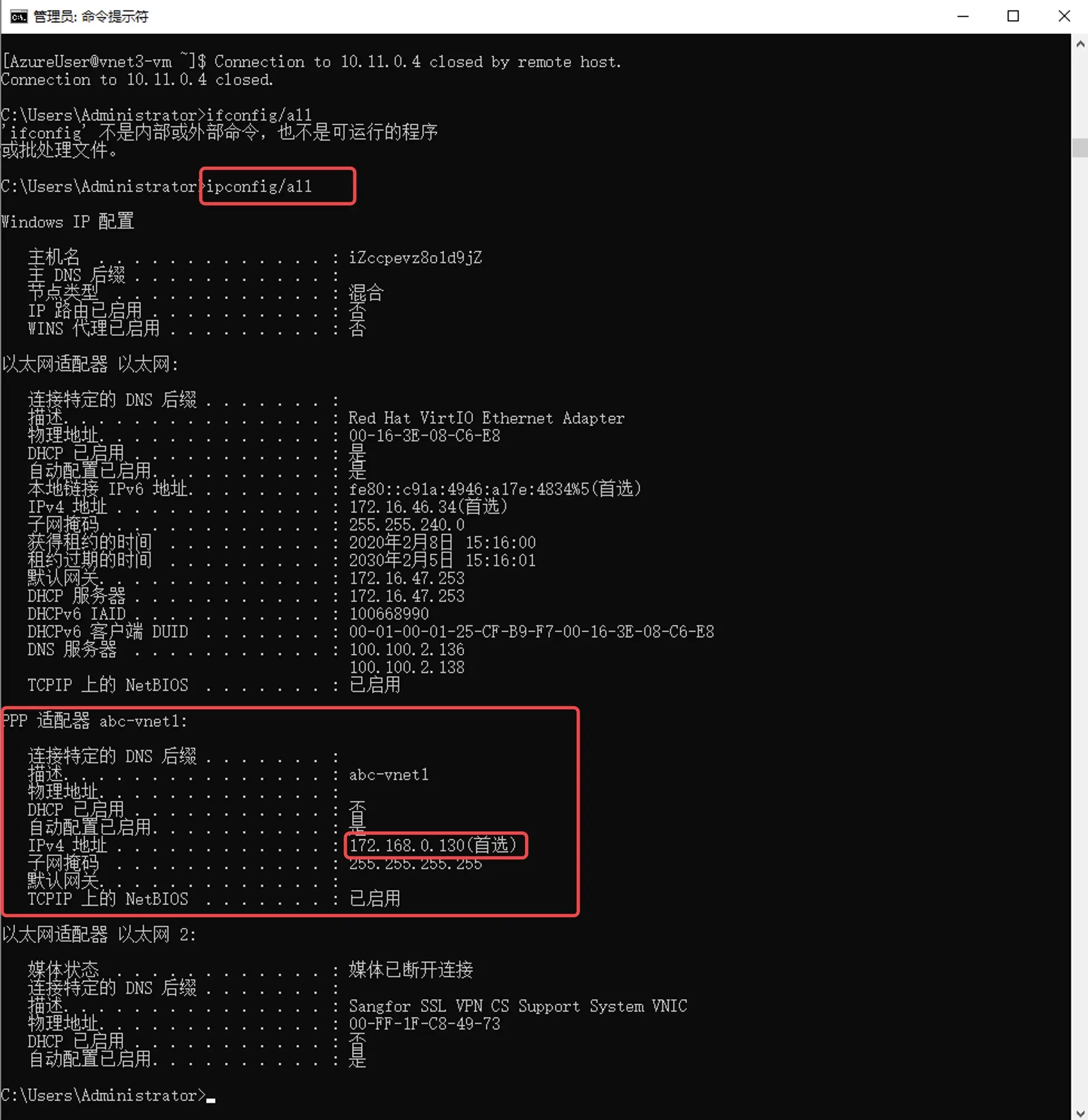 ipconfig/all,可以看到有PPP适配器abc-vnet1说明vnp连接成功