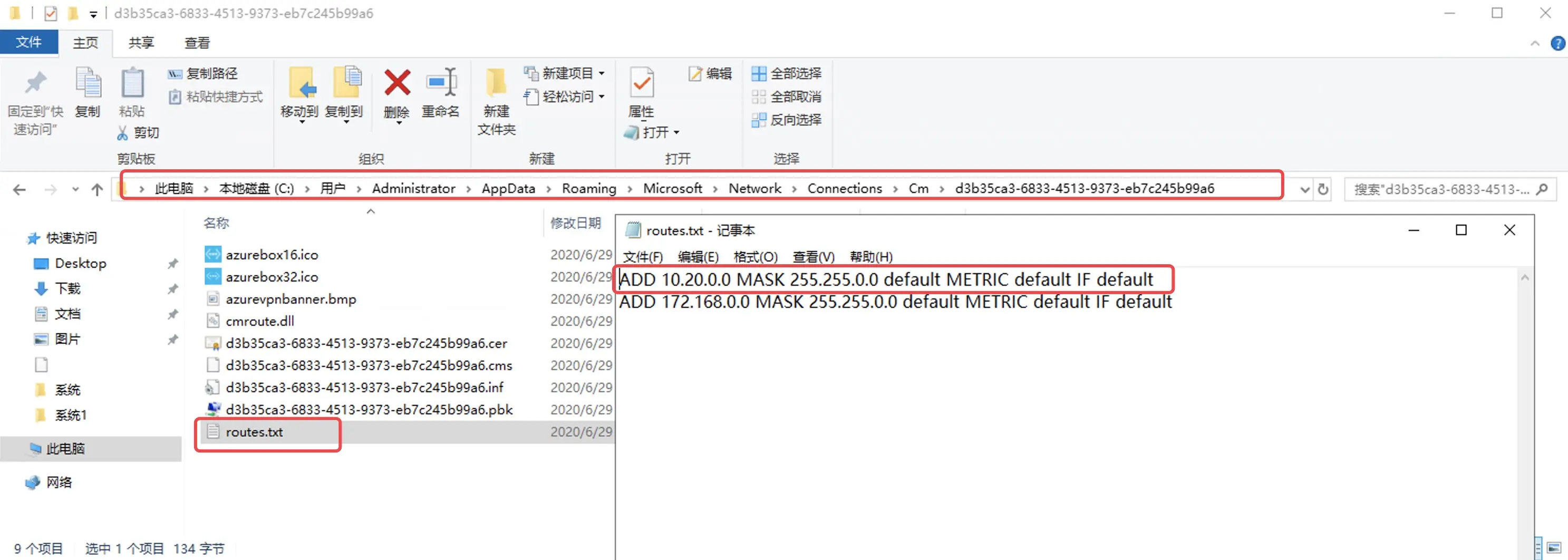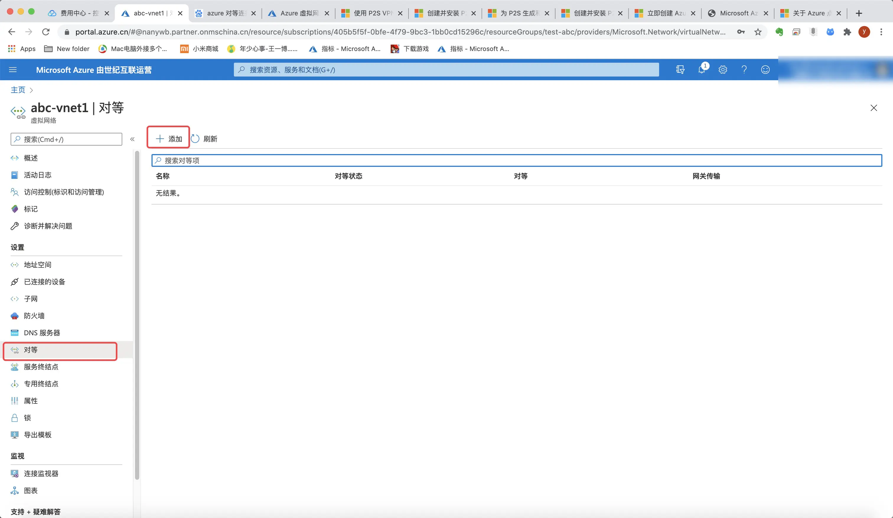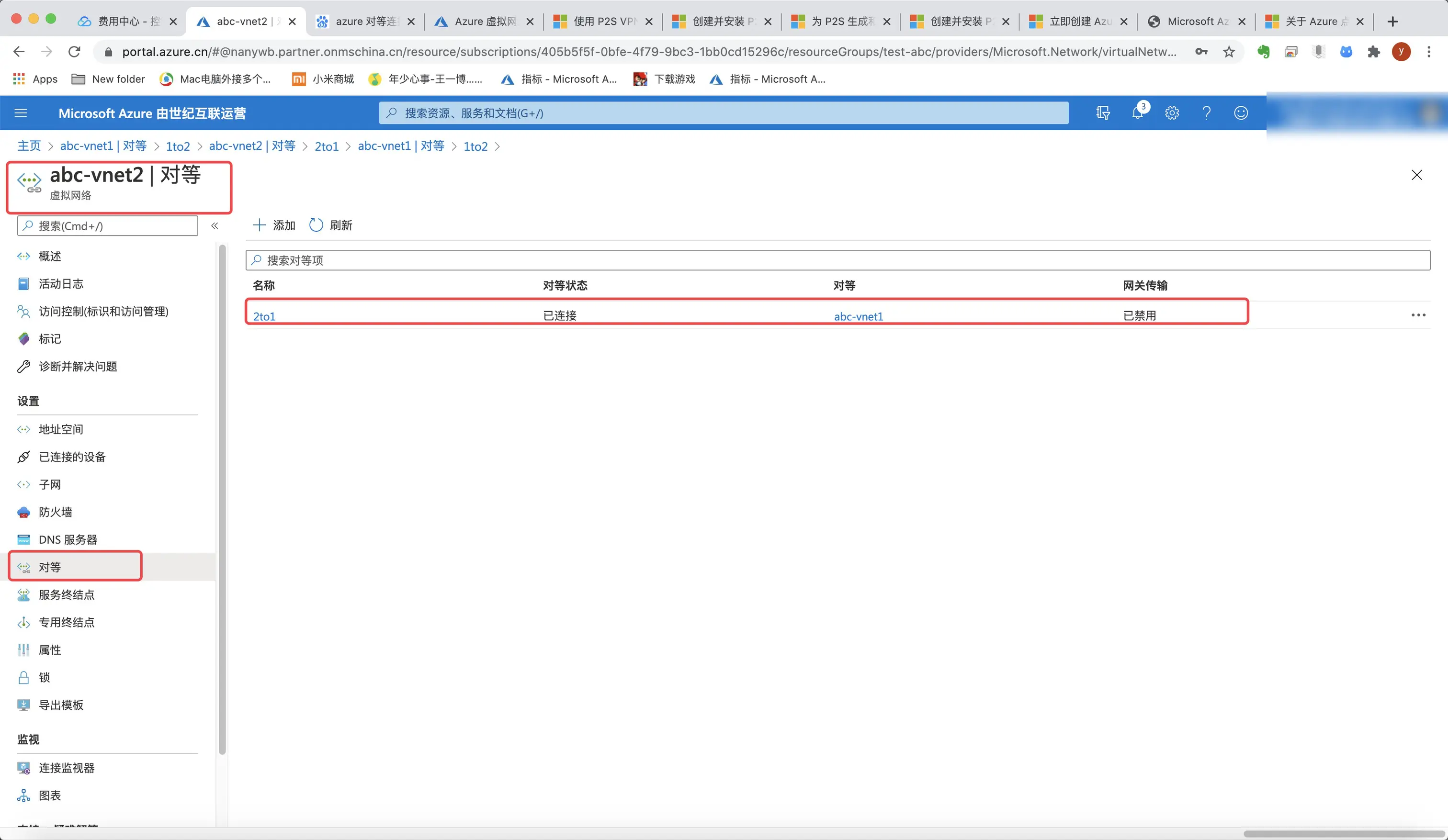 C:\Users\>用户名>\AppData\Roaming\Microsoft\Network\Connections\Cm\<GUID串>可以看到我们abc-vnet1的网段信息。只有10.20.0.0,没有abc-vnet2的10.21.0.1,显然这是无法连通的,所以我们要进行对等连接配置。
