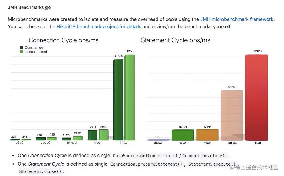 这两个图分别为官网中的内容,图一主要表明了HicariCP连接池的特点,快如光速