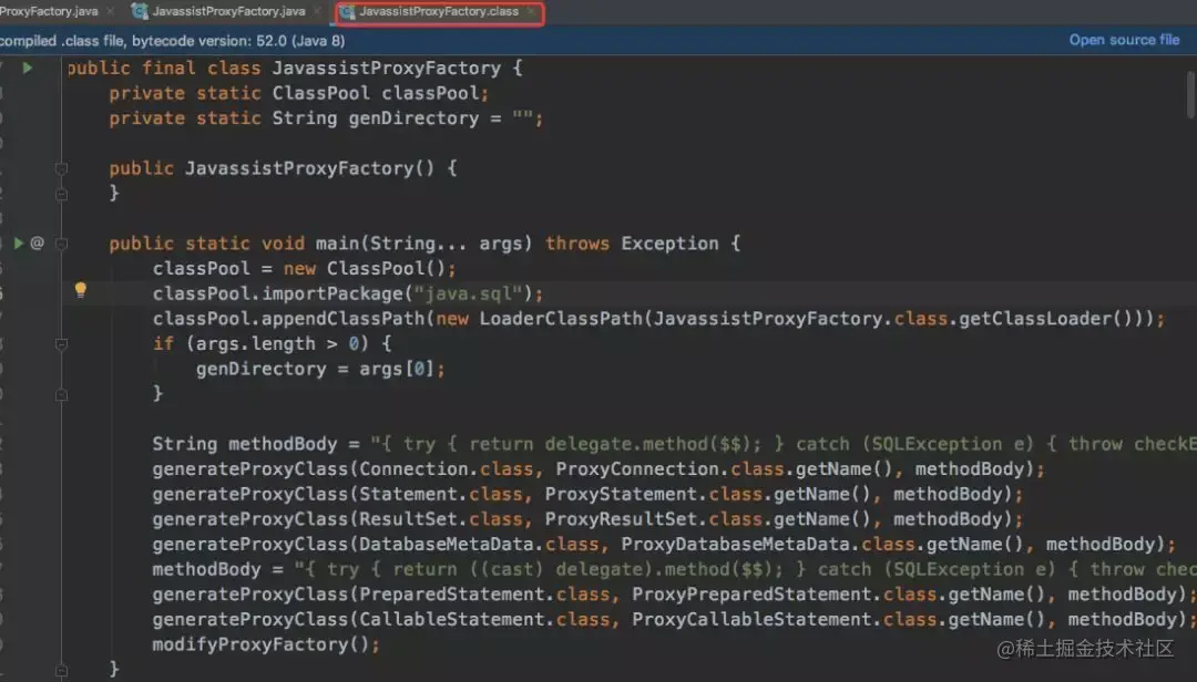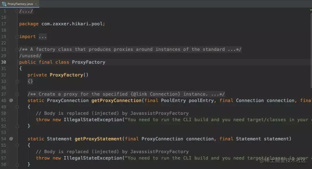 我们发现这些代理方法中只有一行抛异常的处理代码,注释写着“Body is replaced (injected) by JavassistProxyFactory”,其实方法body中的代码是在编译时调用JavassistProxyFactory才生成的,编译后的JavassistProxyFactory.class类代码如下图
