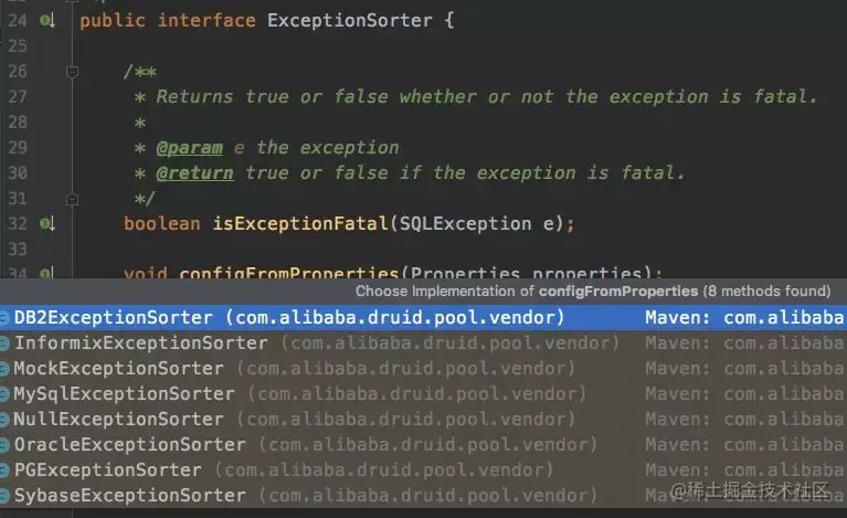 下面是ExceptionSorter接口,各个数据库实现类通过实现这个接口,进行方法的定制化覆盖