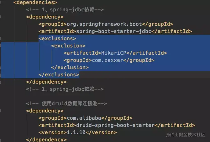 虽然经测试发现,不排除HicariCP依赖,Spring Boot 也会直接使用主动引入的Druid,但是为了项目的简洁,以及可管理性,尽量排除掉比较好