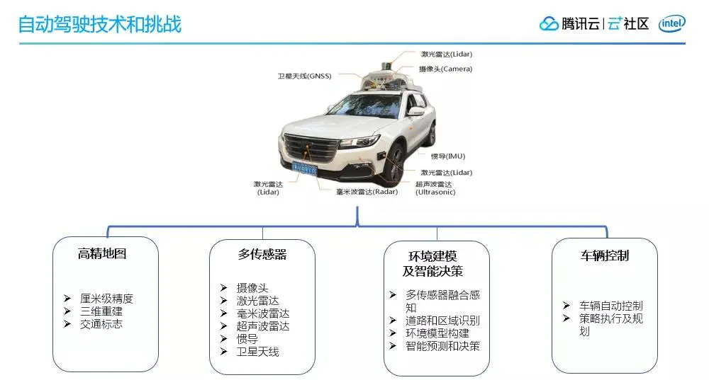 第三是环境建模及智能决策,其中包括多传感器融合感知、道路和区域识别、环境模型构建、智能预测和决策等。