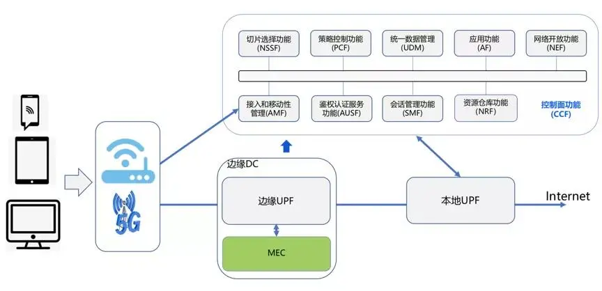 控制面有很多的功能实体,这些功能都是 5G 网络专用的核心网网元。MEC需要部署在边缘UPF附近,通过本地分流能力将手机用户的业务请求引导到MEC上,由MEC上部署的应用为其提供服务。
