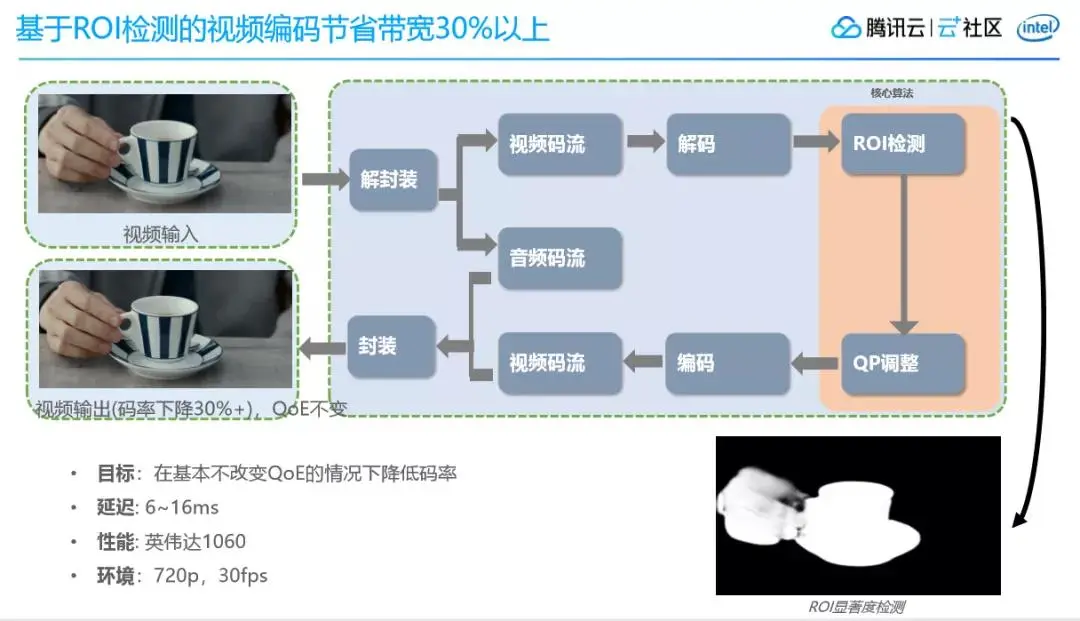视频类应用是边缘计算典型的应用场景。TMEC提供有高质量的视频转码能力,它是基于用户感兴趣区域ROI的视频编码技术,通过这个技术可以在不影响用户体验质量的情况下,将码率降低30%以上。
