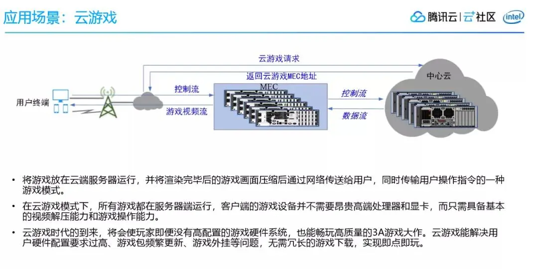 整个解决方案分成三个层次,最上面是业务层,是TMEC支持的主要的边缘应用,比如云游戏、视频直播、智慧出行、智慧影视、智能制造等。我们看到这些业务绝大部分都和视频相关,这是因为视频在网络中占的带宽非常大,边缘计算可以很好地解决视频相关应用对网络带宽的占用,同时保证手机端的用户体验。