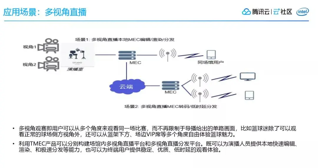 利用TMEC部署边缘应用,可以分别构建场馆内多视角直播平台和多视角直播分发平台。既可以为演播人员提供本地快速编辑、 渲染、和极速分发等能力,也可以为终端用户提供稳定、优质、低时延的观看体验。