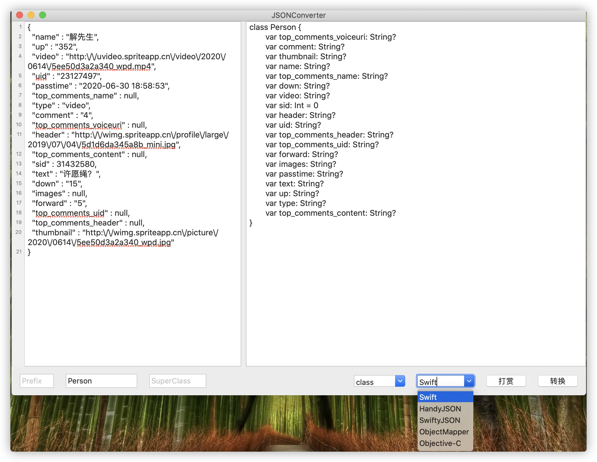 Objective-C、Swift、Flutter以及目前流行的第三方库:SwiftyJSON、HandyJSON,ObjectMapper,可以灵活选择构建class/struct,并支持配置类名前缀等,省去手敲模型的麻烦,借此提高我们的开发效率。