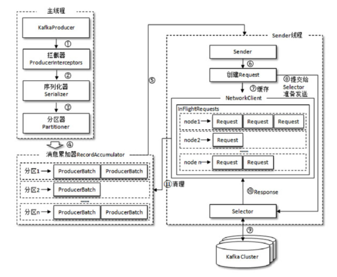 在主线程中由KafkaProducer创建消息,然后通过可能的拦截器、序列化器和分区器的作用之后缓存到消息累加器(RecordAccumulator,也称为消息收集器)中。