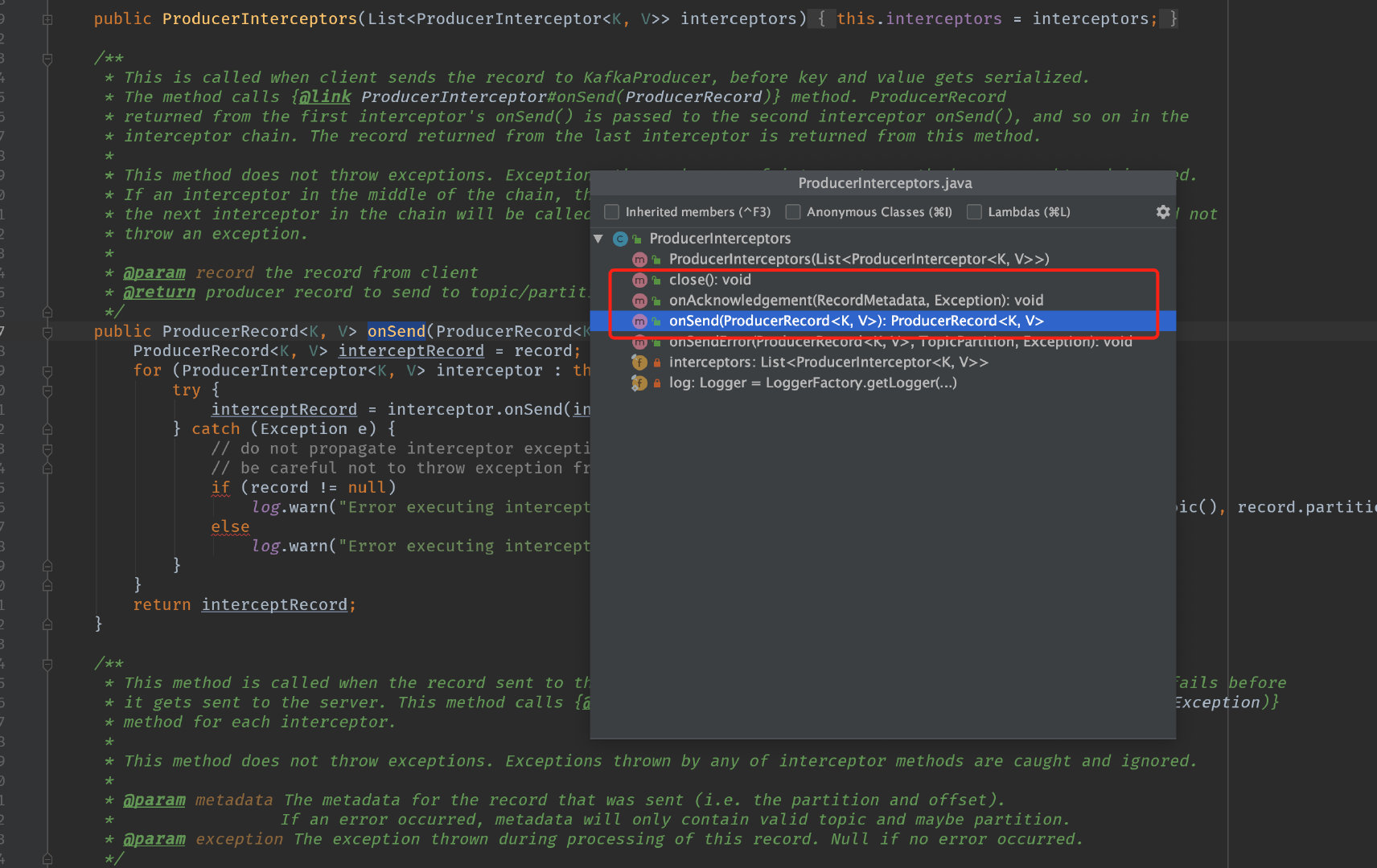 KafkaProducer() 在将消息序列化和计算分区之前会调用生产者拦截器的onSend()方法来对消息进行相应的定制化操作。