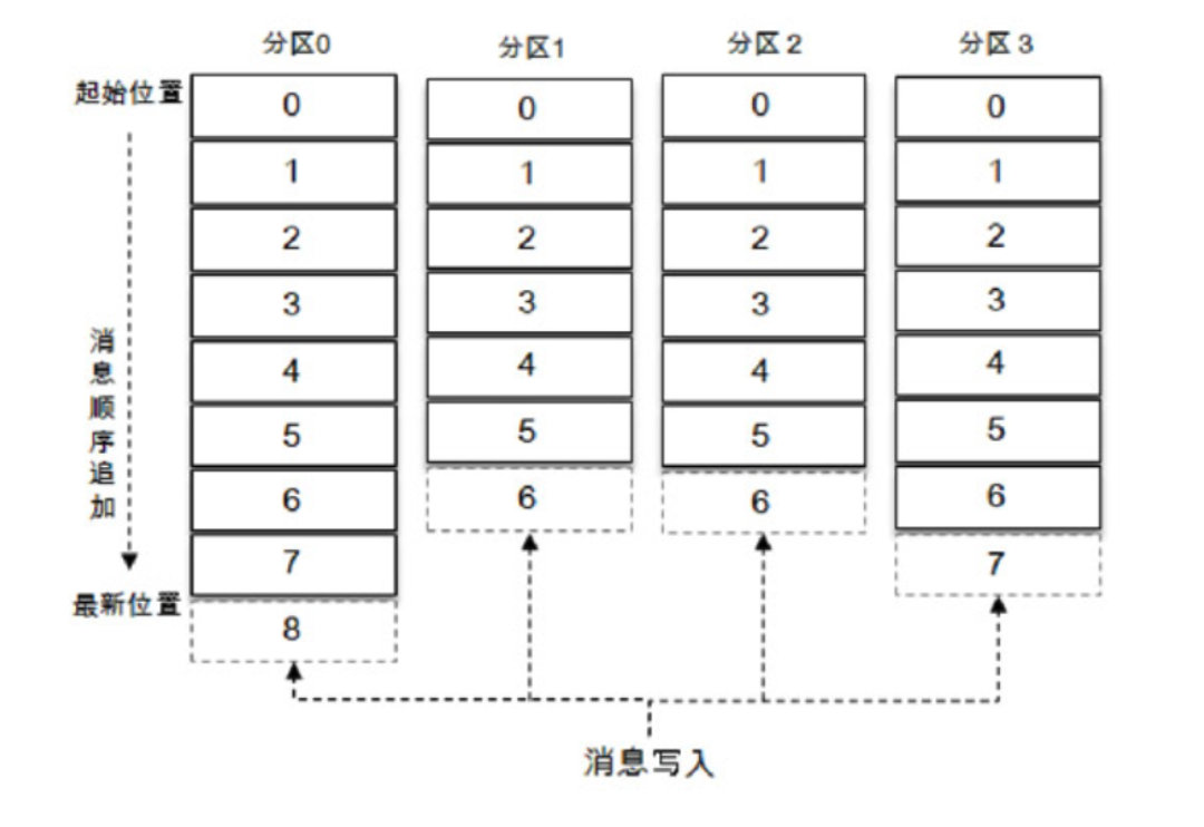 主题是一个逻辑上的概念,它还可以细分为多个分区,一个分区只属于单个主题,很多时候也会把分区称为主题分区(Topic-Partition)。同一主题下的不同分区包含的消息是不同的,分区在存储层面可以看作一个可追加的日志(Log)文件,消息在被追加到分区日志文件的时候都会分配一个特定的偏移量(offset)。offset是消息在分区中的唯一标识,Kafka通过它来保证消息在分区内的顺序性,不过offset并不跨越分区,也就是说,Kafka保证的是分区有序而不是主题有序。如图所示,主题中有 4 个分区,消息被顺序追加到每个分区日志文件的尾部。Kafka中的分区可以分布在不同的服务器(broker)上,也就是说,一个主题可以横跨多个broker,以此来提供比单个broker更强大的性能。