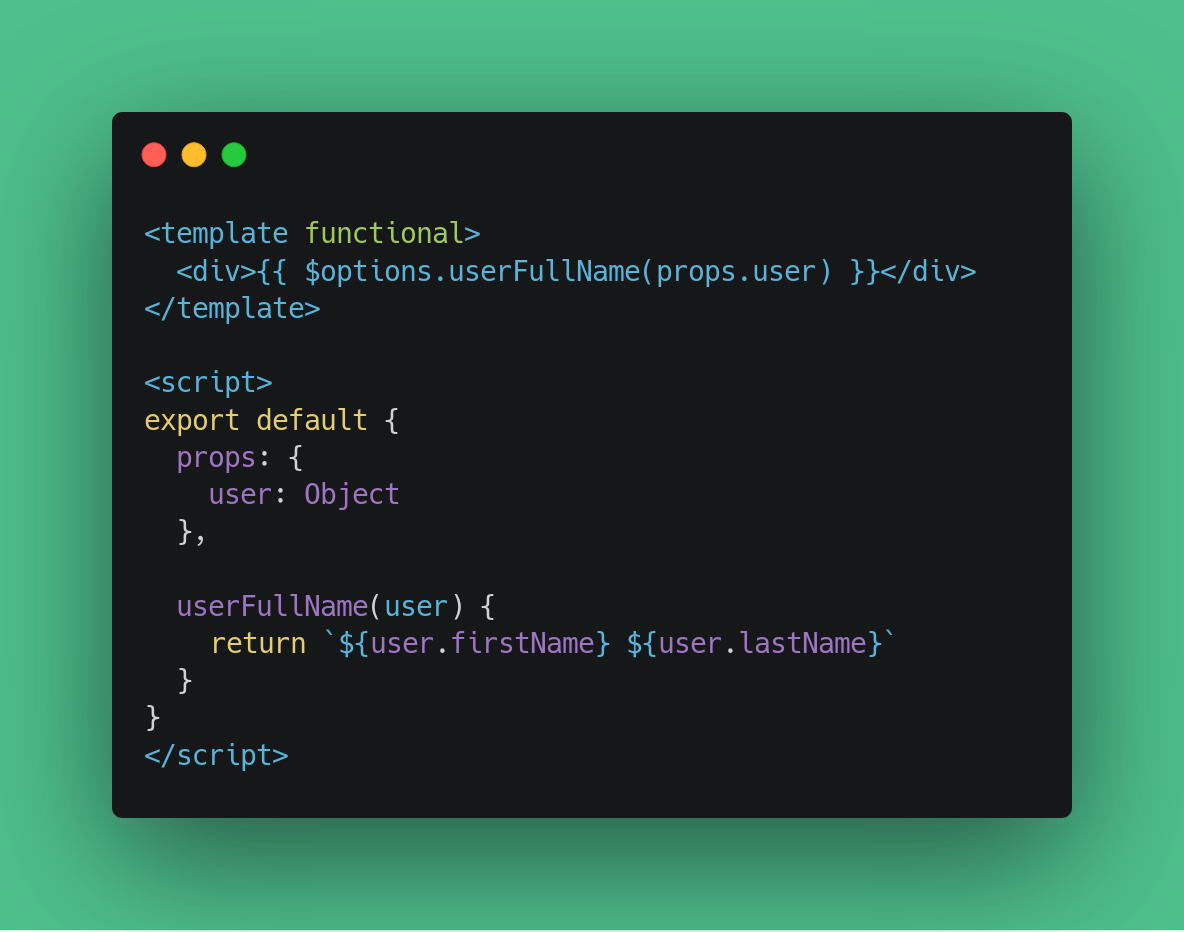 就拿经典的 fullName 例子来说,在一个函数式 <template> 中,可以通过直接在组件定义中提供一个方法,并在之后使用 Vue 提供的 $options 属性来调用我们自定义的方法,以达到目的: