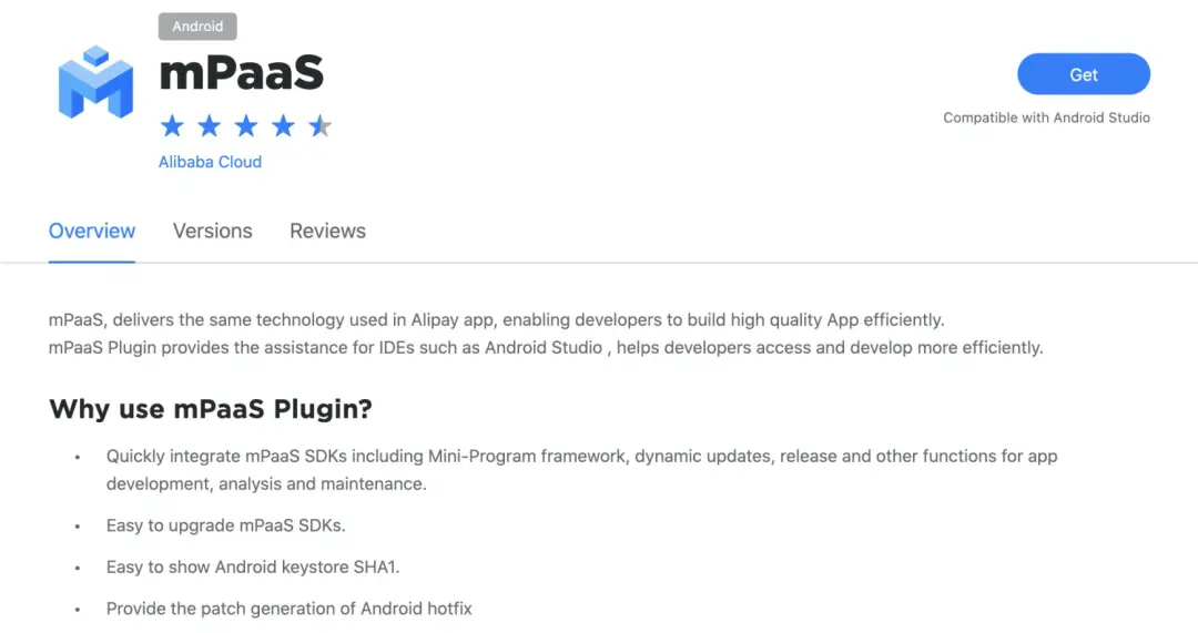 mPaaS for Android Studio 是一个基于 Android Studio 的插件,用于快速集成/更新 mPaaS SDK,并同时为 mPaaS 控制台提供与开发者高互动性的入口。