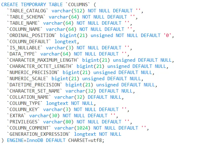 所以大家可以看到,其实我们在DDL的语句上面的属性,几乎都可以在COLUMNS表上查到。