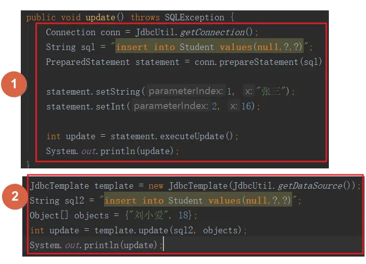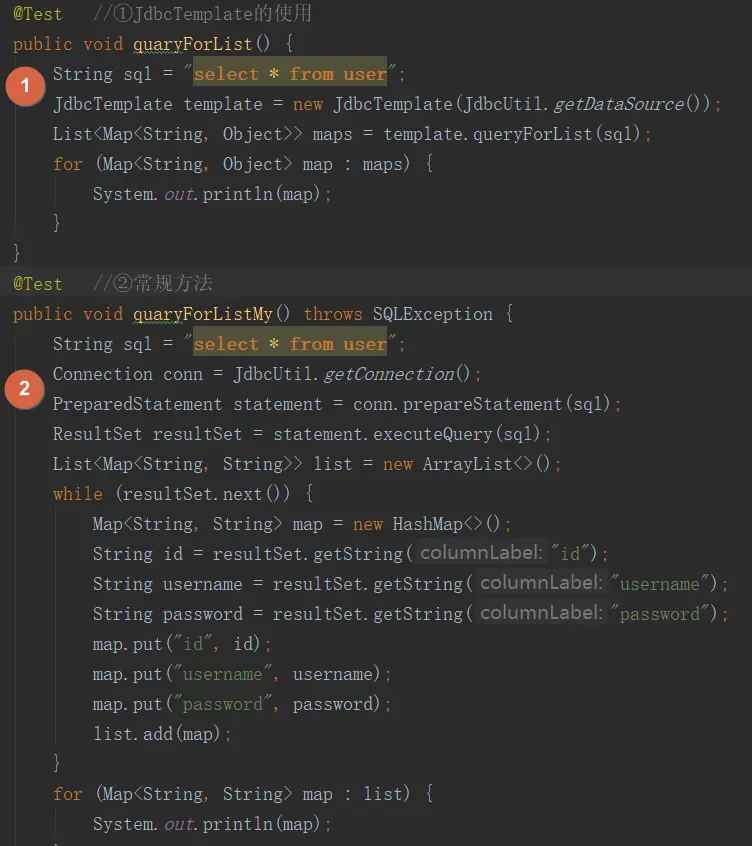 ①是常规方法,②是JdbcTemplate。显然②更加简洁。