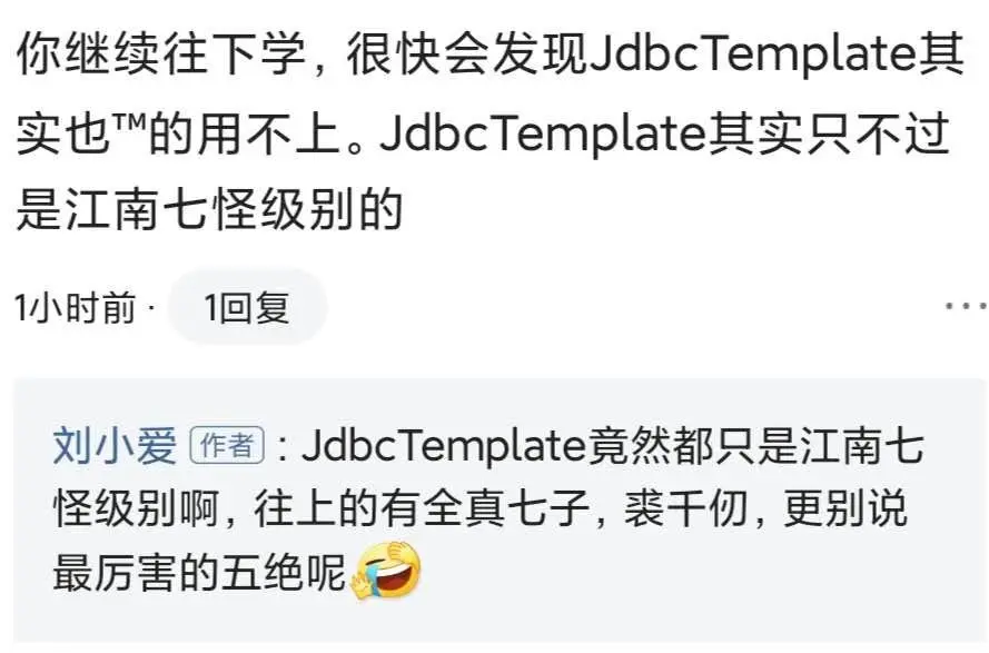 当时我立马就惊呆了,这特么,怎么感觉学的以后都用不着了,并且JdbcTemplate竟然只是江南七怪级别的?那五绝是指?